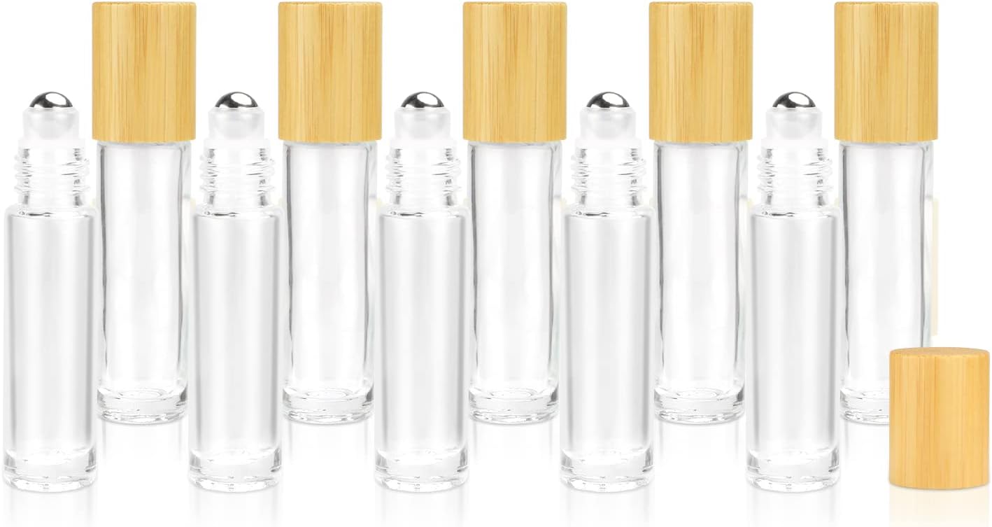Material : glass+wooden caps,Size : Approx. L 2.0*8.6cm,Packaging contains:10 empty clear glass roller botlle come with 2 Pipette,1 Opener.