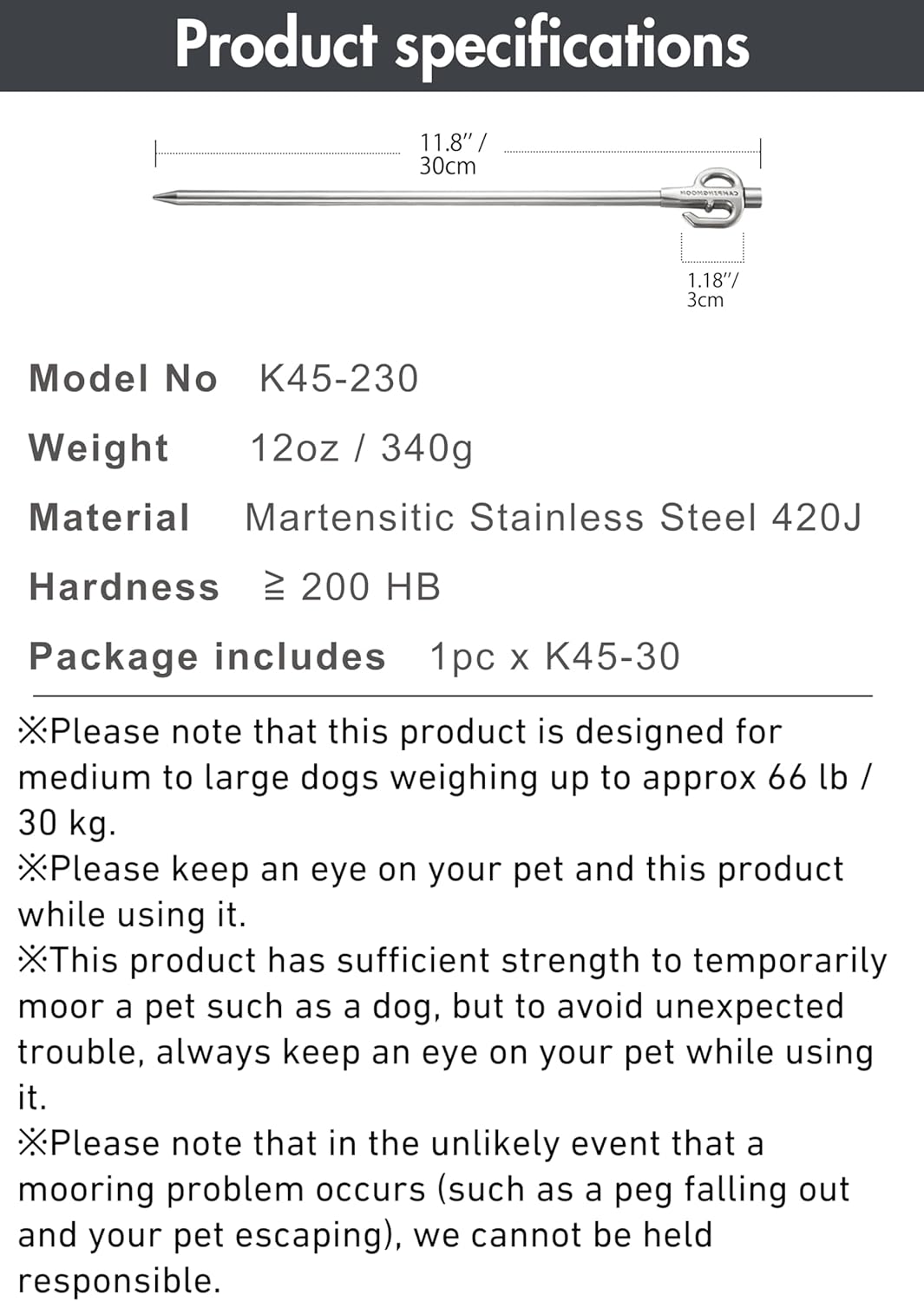 MATERIAL:STAINLESS STEEL 420J. 20% -50% up in hardness than general stainless steel (SUS304). This dog tie out stake is incredibly strong to hold down your dog on hard ground.