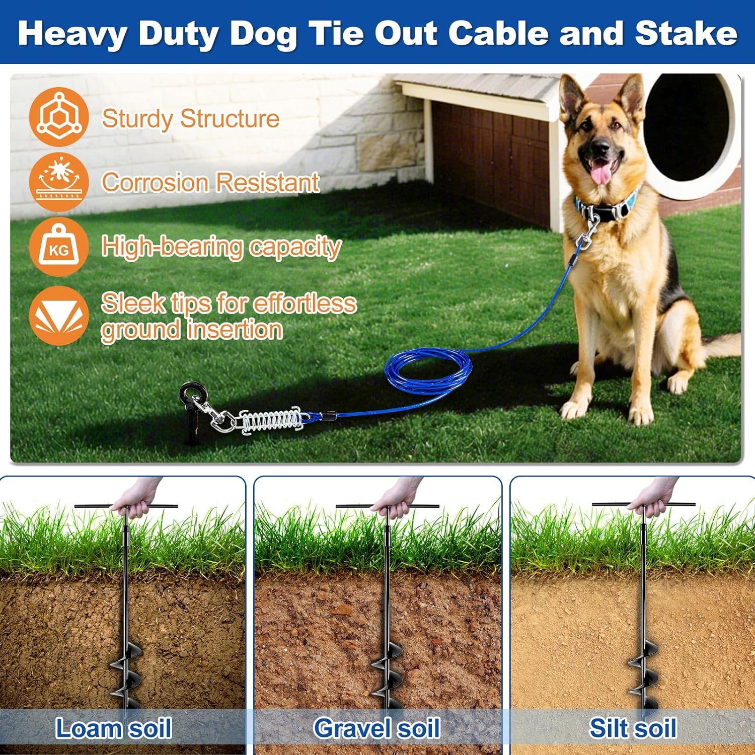 𝐀𝐧𝐭𝐢-𝐑𝐮𝐬𝐭 𝐃𝐨𝐠 𝐒𝐭𝐚𝐤𝐞:This heavy duty steel dog stake features a rust-resistant black coating and 360°welded spiral design for enhanced durability.The 2.7-inch blades and sharp tip allow for easy installation in soil,grass and hard surfaces (𝐍𝐨𝐭𝐞:Not recommended for soft sand,hard rock or heavy root soils),providing a secure hold that withstands pulling and tough weather conditions.