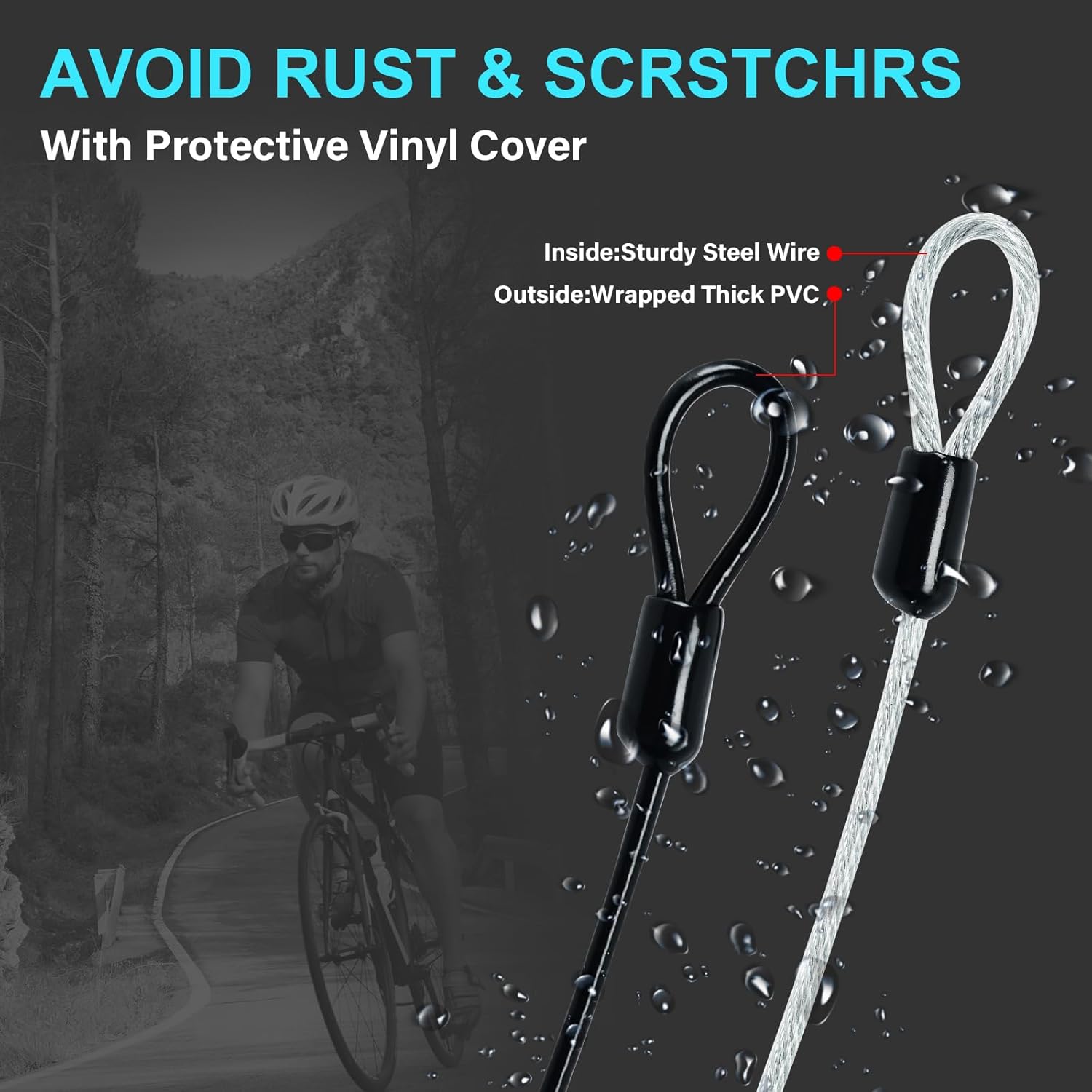 DURABLE & LIGHTWEIGHT CONSTRUCTION: Each security cable is made of high-quality alloy steel and PVC, rust-resistant, lightweight and durable. A fully sealed, smooth coating helps prevent rust and scratches, and protects your hands from accidental pokes or injuries during use.