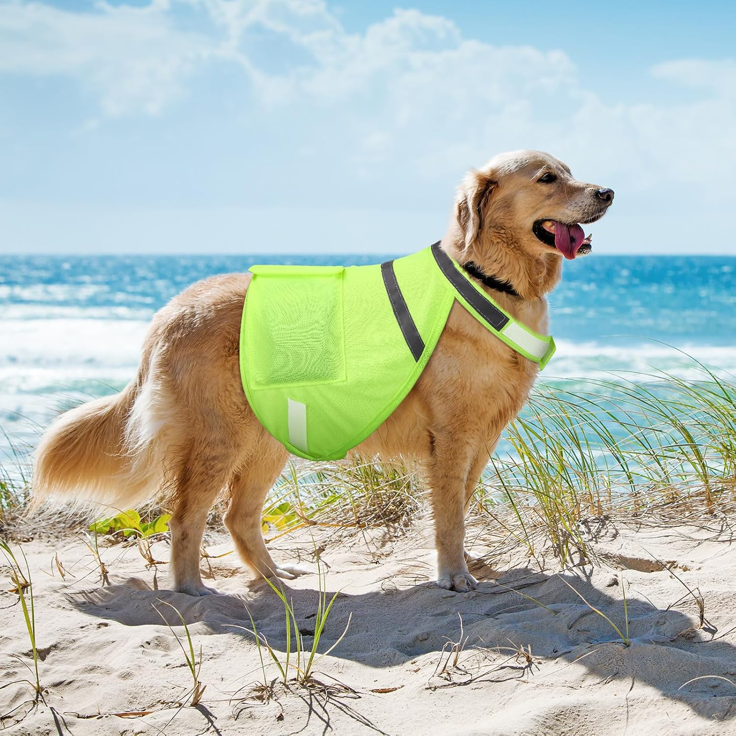 Convenient Design: the dog cooler harness features a stylish combination of fluorescent green and silver reflective strips; This not only makes your dog look fashionable but also enhances its visibility in low-light situations, ensuring safety during walks; There are two ice pack pockets on the sides to prevent the ice packs from falling out