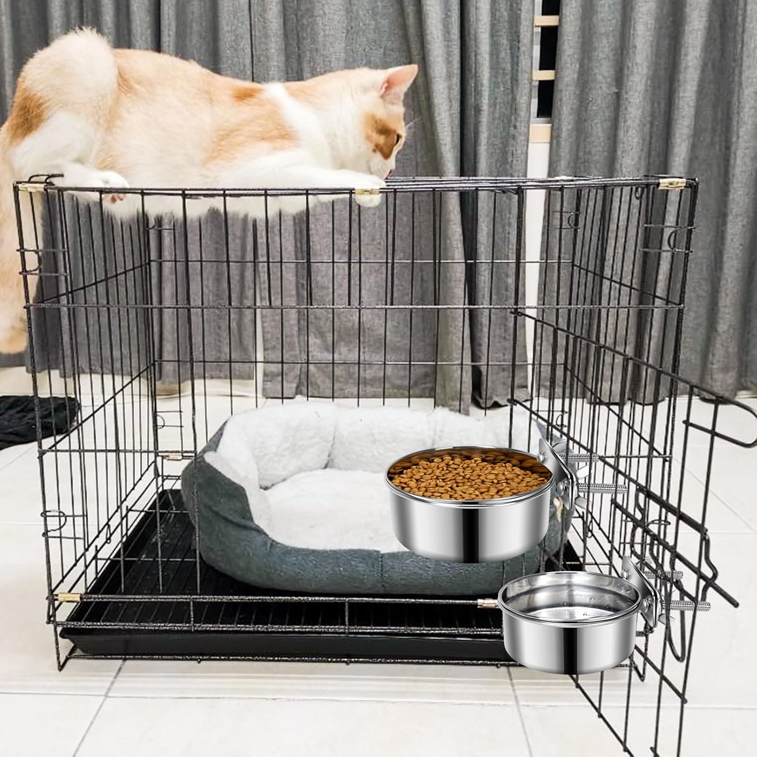 2 Pack Hanging Stainless Steel Dog & Cat Bowls with Clamp – Non-Spill