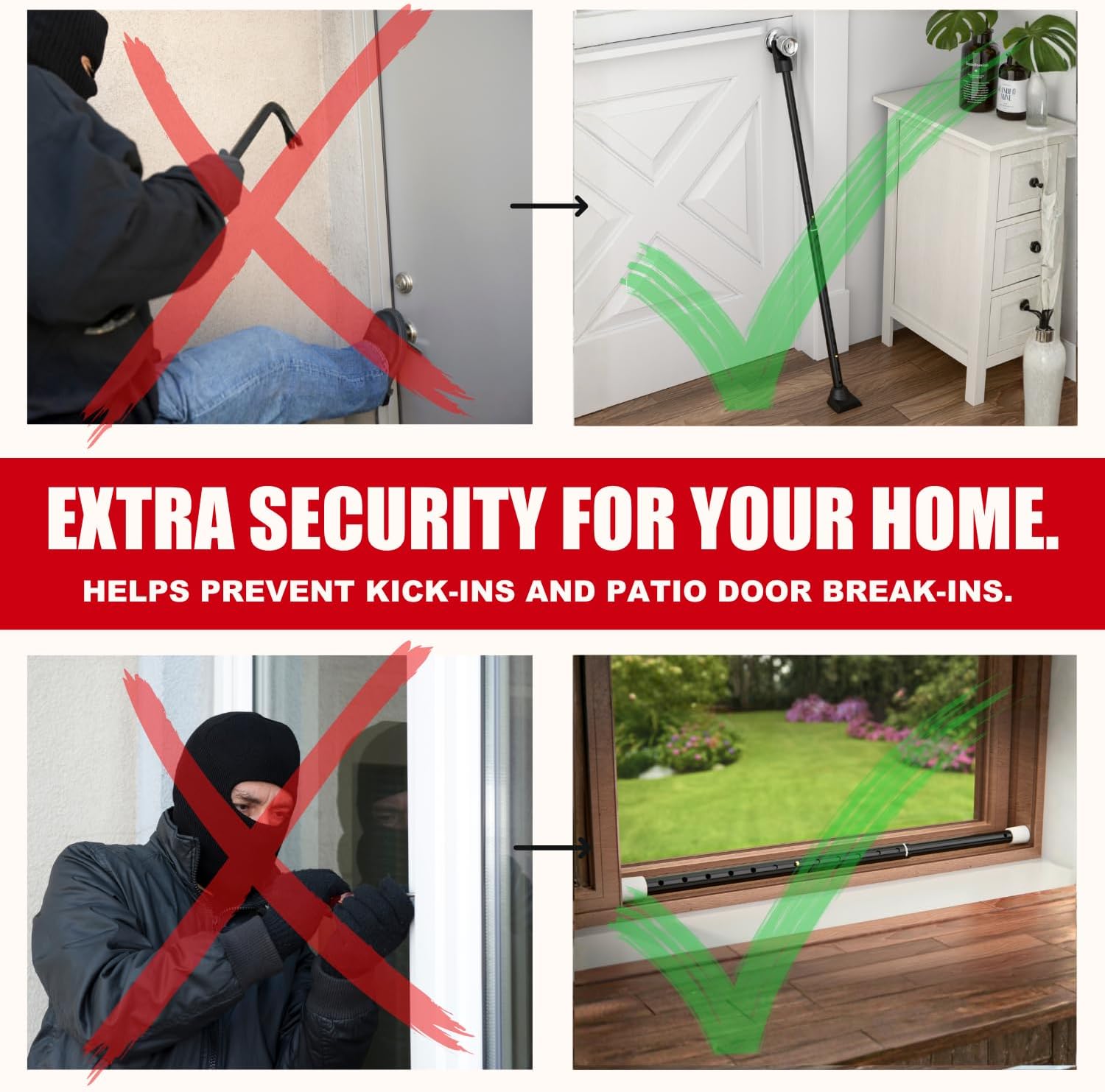 Easy to Use: Easily props under door knob and easy to remove. Security burglar bar can also be easily adjusted