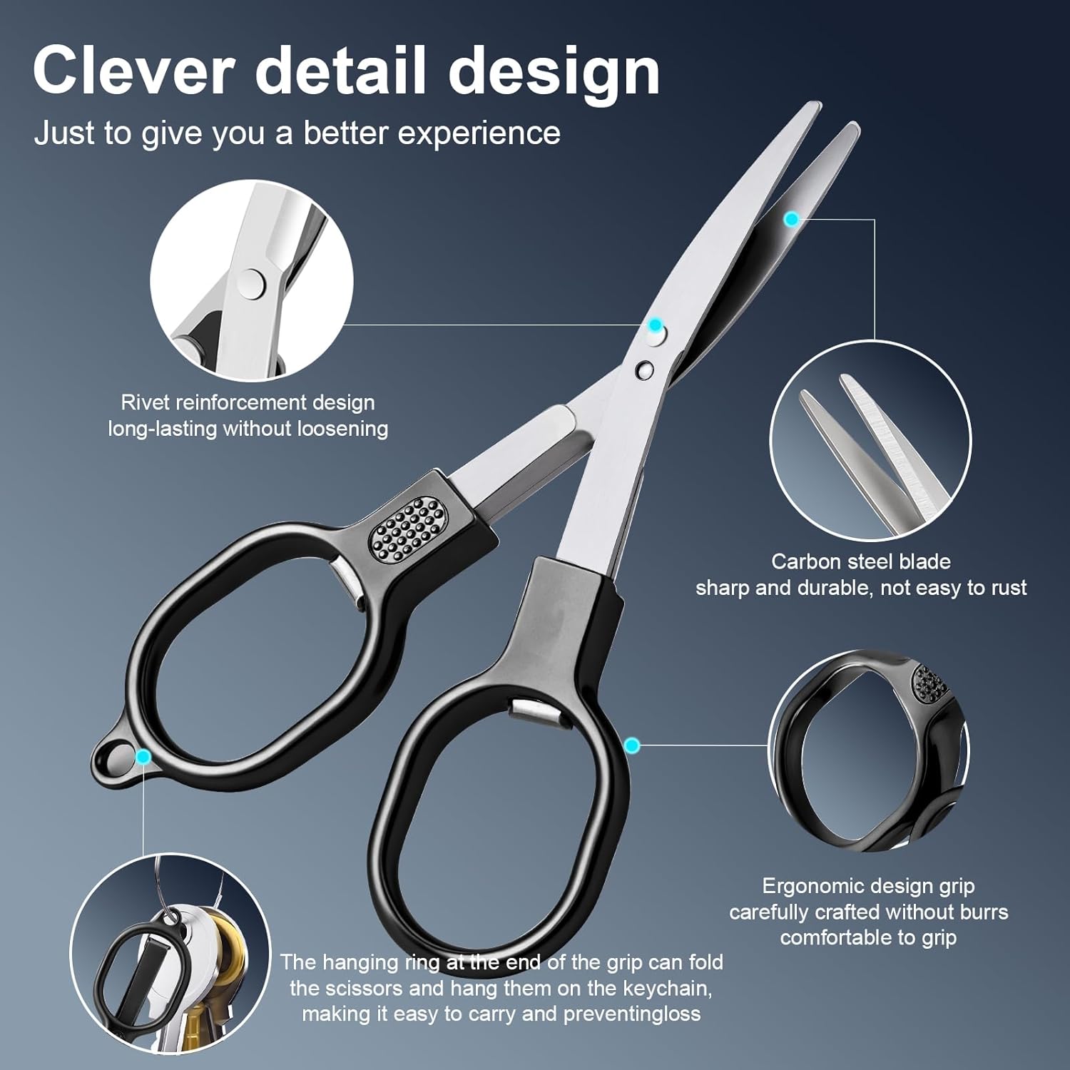PORTABLE: Small sharp scissors are lightweight and foldable, easy to carry for travel or daily use, comes with a key ring that can be hung on a backpack or key chain, very convenient