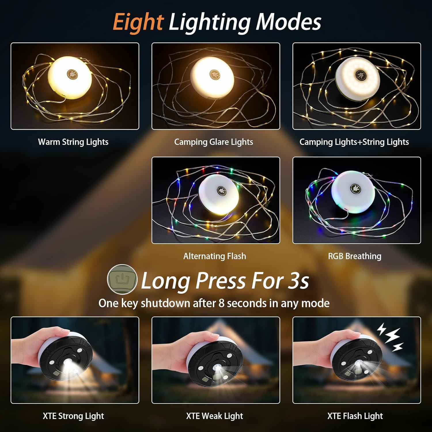 This camping lights string has 5+3 modes to choose from: String Lights Warm Light – String Lights RGB Alternate Flashing – String Lights RGB Breathing – SMD Warm White+String Lights Warm Light – SMD Strong Light, press and hold the button for three seconds to enter the XTE light mode: XTE Strong Light – XTE Weak Light – XTE Flash. (After 8 seconds of lighting in any mode, press the switch to turn off.)