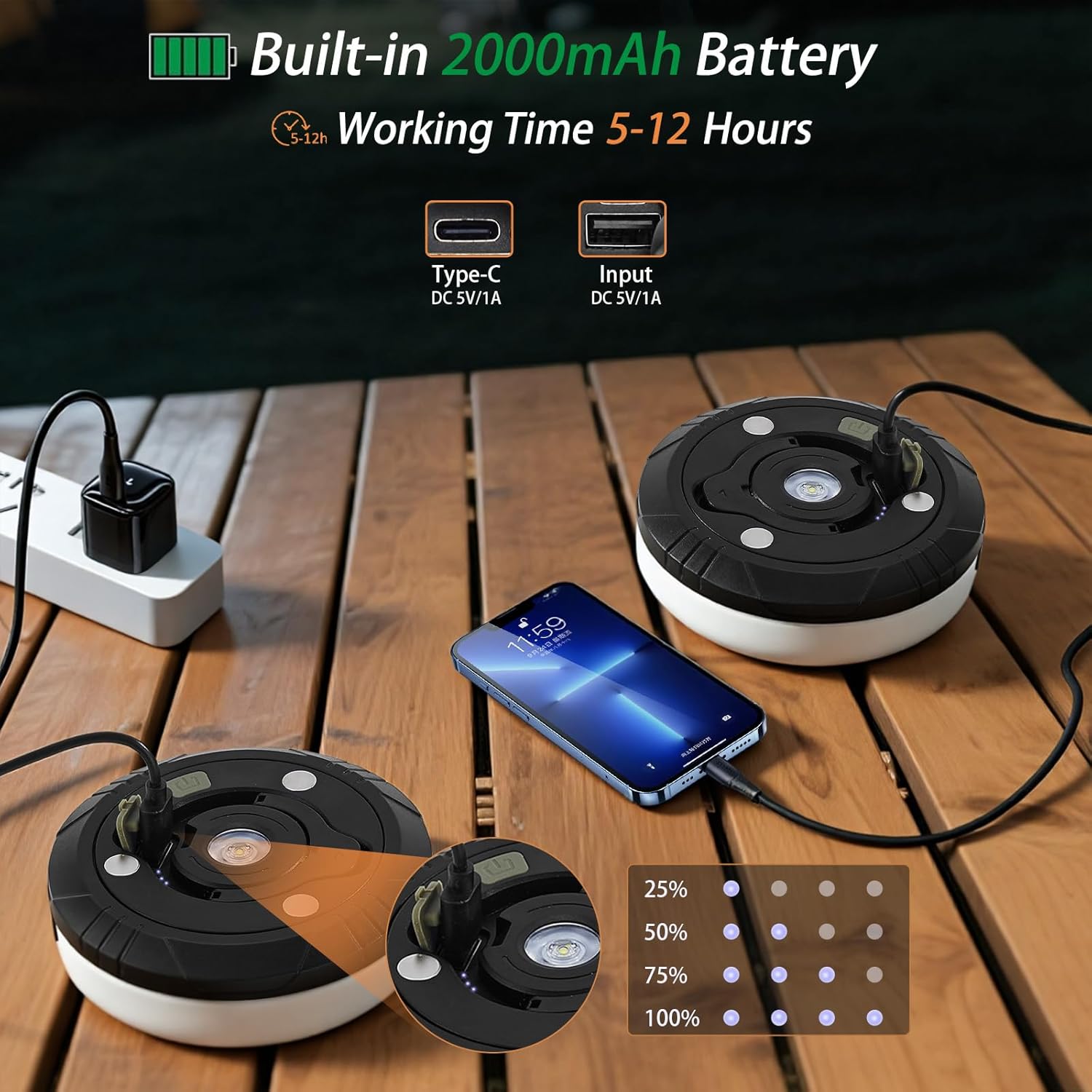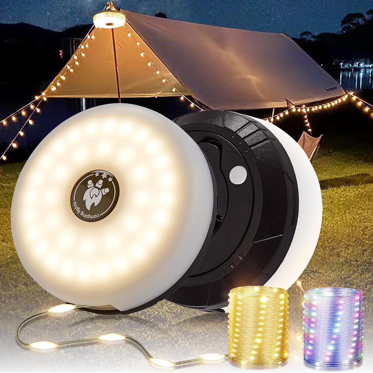 Emergency Lights — The middle LED remote light source, long press the switch to turn on, highlights the spotlight with strong light, and is a good helper for emergency lighting at night.Easy to Store — The camp lights is equipped with a hand-operated device, which can be recovered quickly in the 30s, which solves the trouble of placing the light belt for you.Type-C Fast Charging — Comes with a USB charging cable, which can be charged in 3 hours and can be connected to the power bank for both charging and use. making it ideal for camping and outdoor activities.2000mAh Battery — Built-in 2000mAh can last up to 7-12 hours on a full charge, depending on the selected mode. It can be used while charging.Intuitive Power Indicator — Stay informed about power status with clear and concise camping string lights outdoor power indicator, being well prepared for an outdoor adventure.