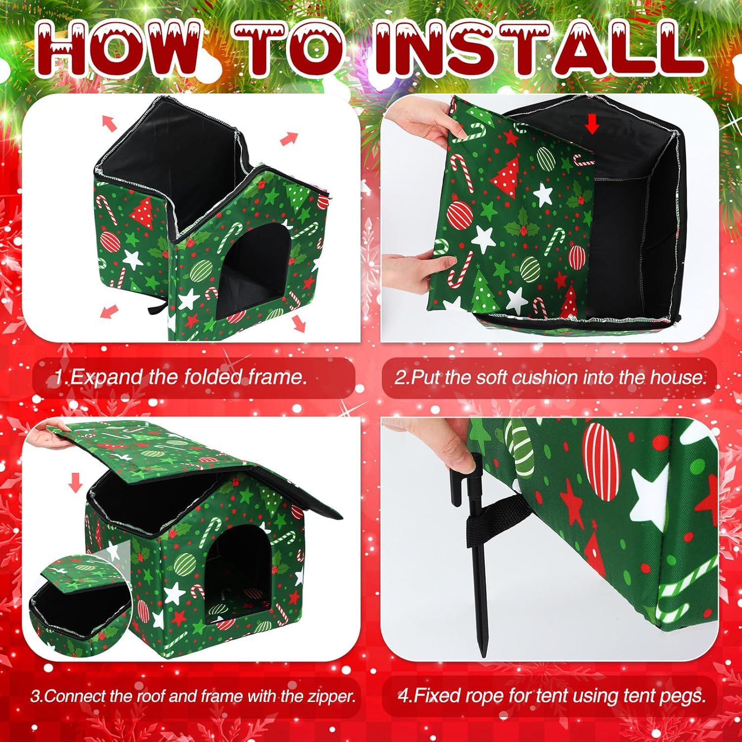 Festive Christmas Styles: designed with 2 classic Xmas holiday-inspired looks, one in red and one in green, these outdoor cat houses bring a cheerful Christmas atmosphere to your garden, porch, or backyard; Not only do they provide warmth and shelter for pets, but they also serve as a decorative touch for your festive outdoor setup