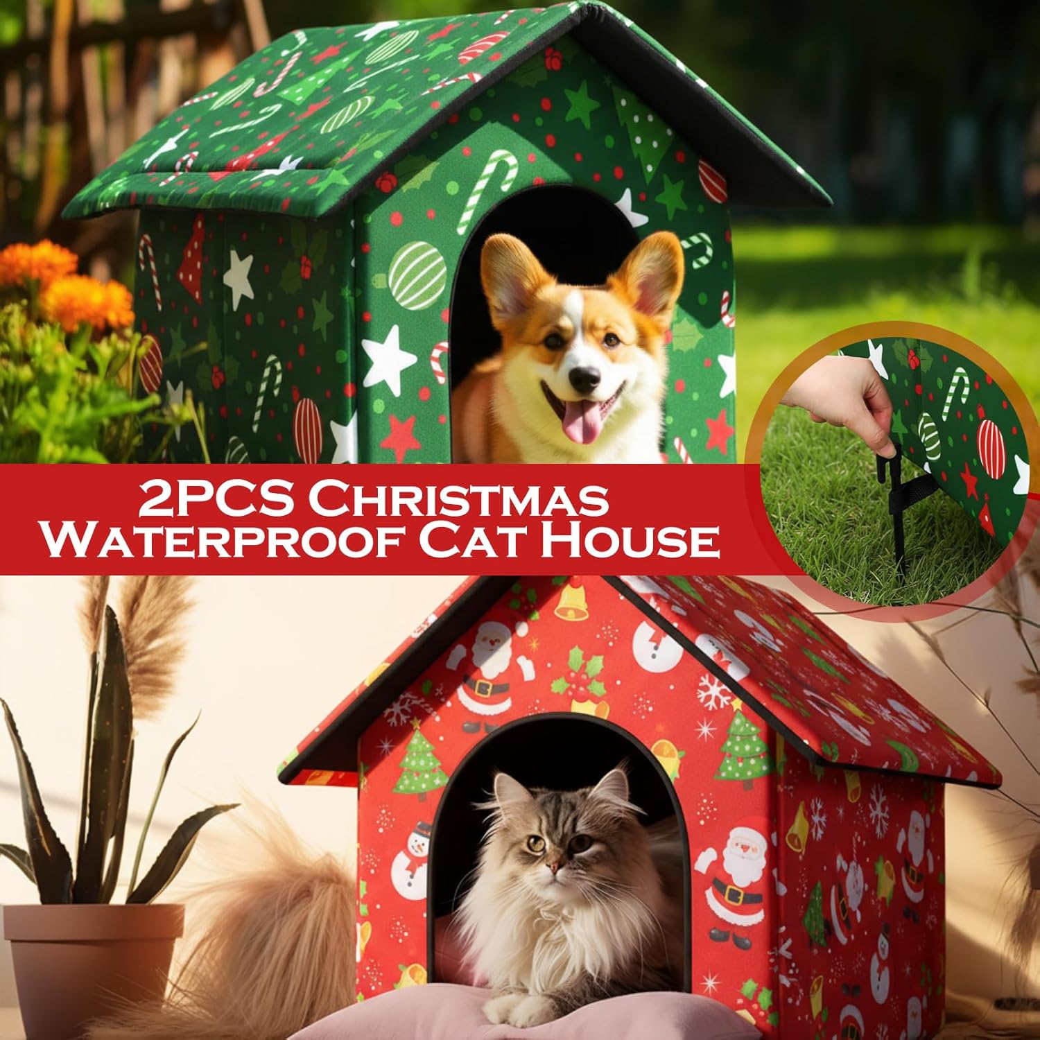 Festive Christmas Styles: designed with 2 classic Xmas holiday-inspired looks, one in red and one in green, these outdoor cat houses bring a cheerful Christmas atmosphere to your garden, porch, or backyard; Not only do they provide warmth and shelter for pets, but they also serve as a decorative touch for your festive outdoor setup