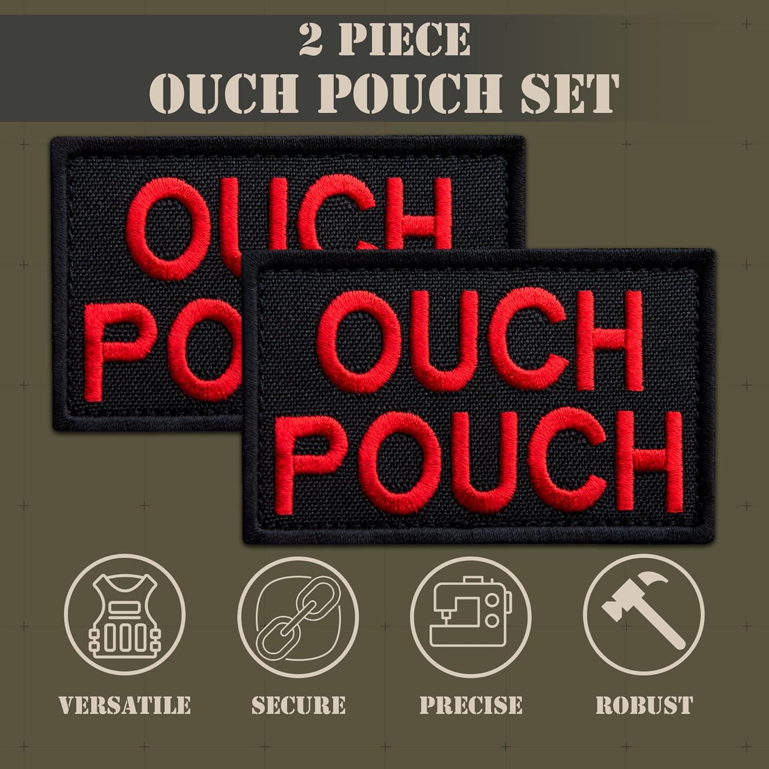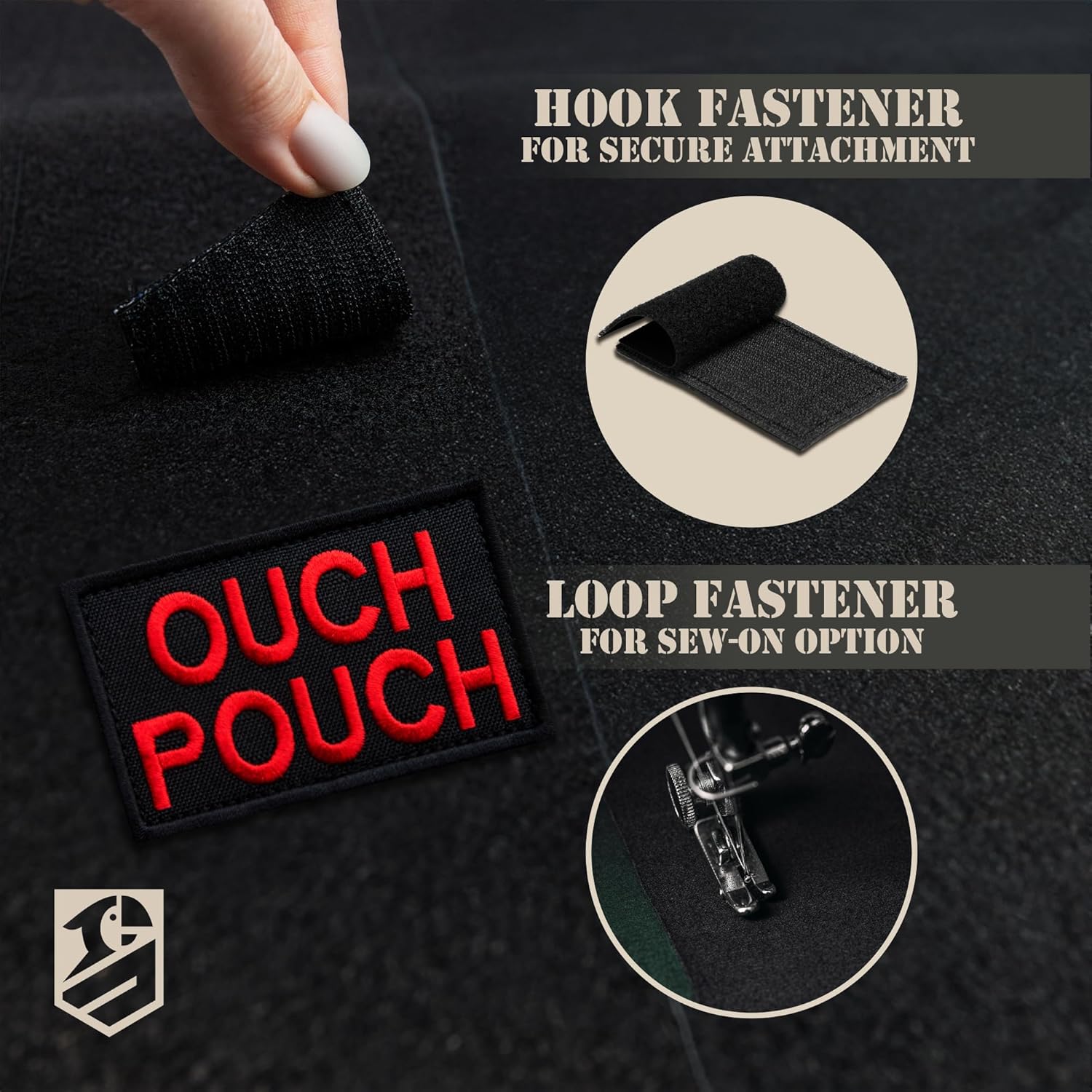OUCH POUCH PATCH SET includes 2 first aid kit patches sized at 2×3 inches (5×8 cm), these versatile funny patches are ideal for tactical backpack, helmet, or bag, adding a touch of personality and practicality to your gear