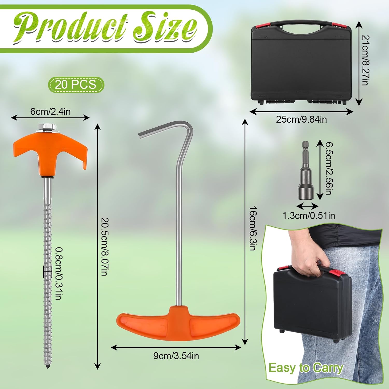 【Complete Storage Solution】This comprehensive tent stake kit includes 20 durable 8-inch carbon steel screw-in stakes, 1 hex driver socket, 1 professional peg puller, and a sturdy black plastic storage box. The organized storage system ensures all components remain protected and easily accessible during outdoor adventures, while the compact design facilitates convenient transportation and prevents loss of essential camping equipment.
