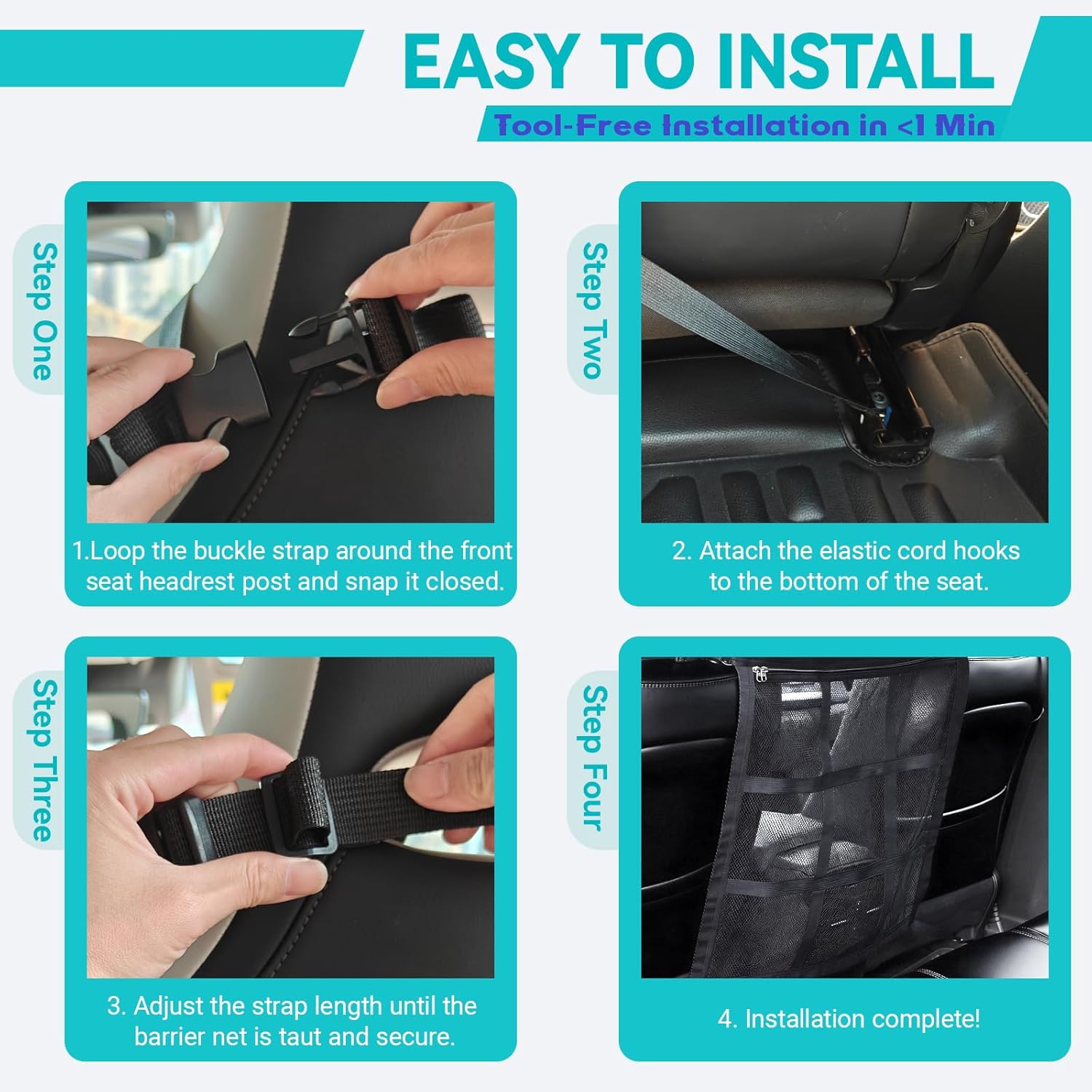Extremely durable! We use 9-grid reinforced double-layer mesh that’s stronger than standard pet nets. This sturdy dog barrier withstands energetic dogs and is a reliable car safety accessory.