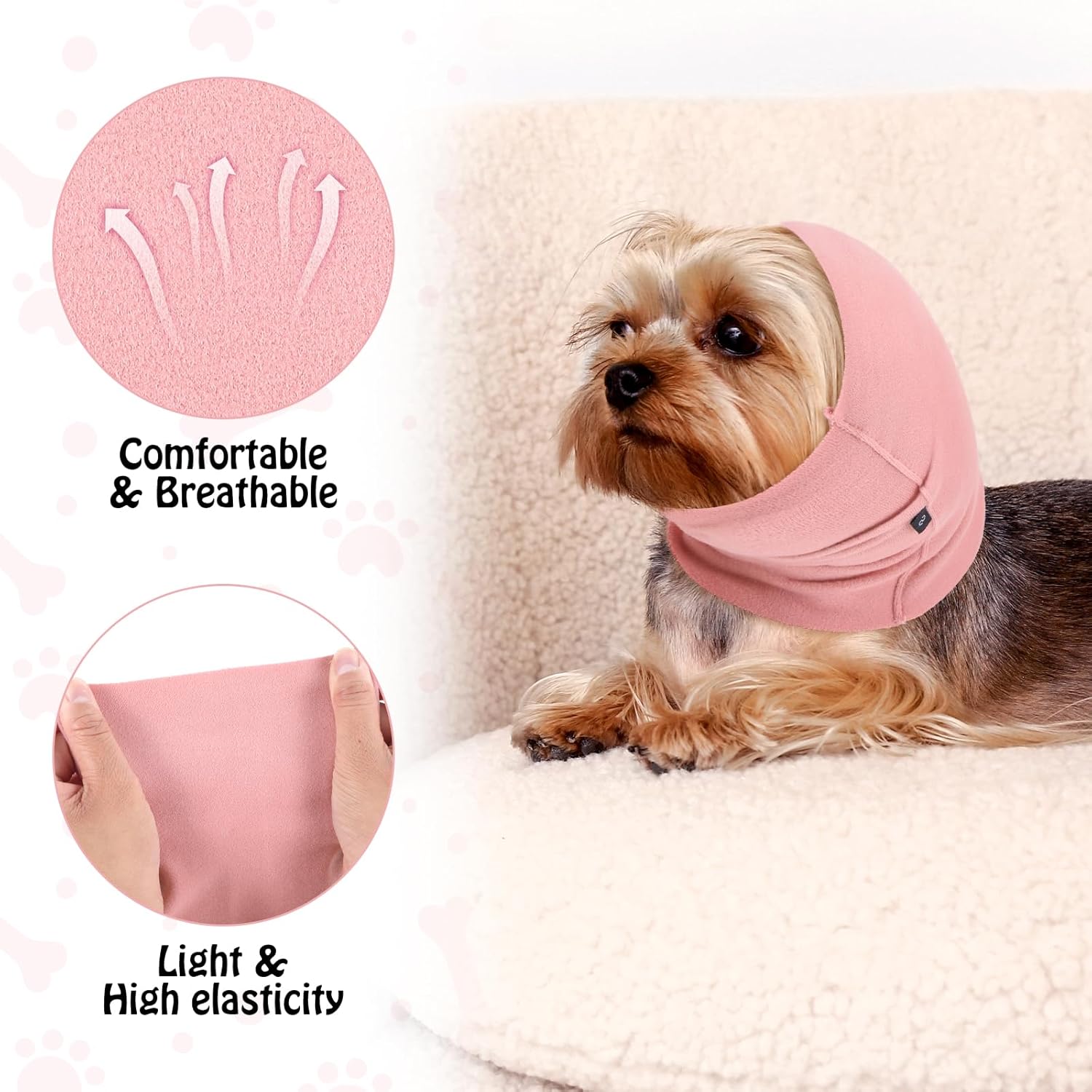 Applicable Occasions: The dog mask can be used to relieve dog anxiety or fear of strangers and new environments, such as pet hospitals, pet grooming, pet bathing, postoperative care, moving, noise, vacuuming, travel, isolation, etc. At the same time, dog ear protection is also suitable for bad weather, such as thunder and lightning, hurricanes, blizzards, etc. No flap ear wraps for dogs can avoid wind and cold while also protecting the ears from noise interference.