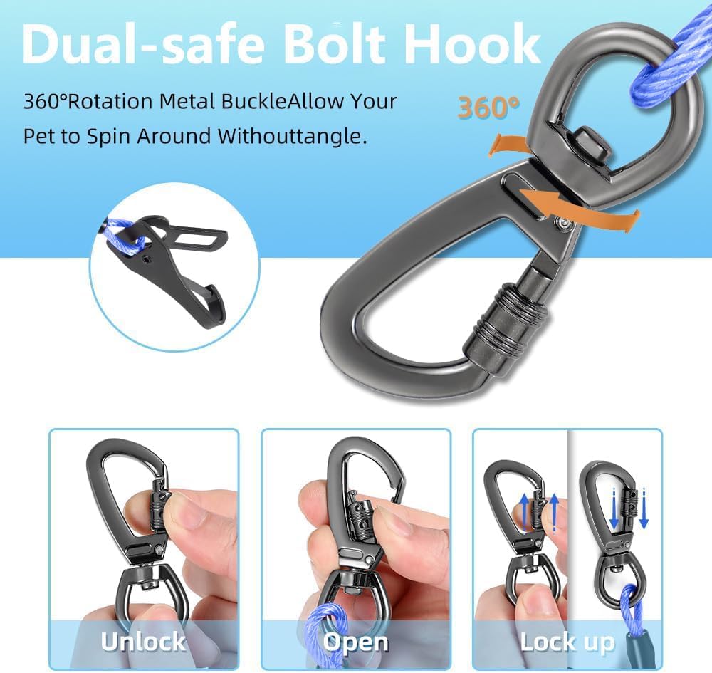 Chew-Proof & Heavy-Duty Construction – Made from industrial-grade plastic-coated stainless steel rope—the same material used in professional dog tie-outs. Built to withstand chewing, pulling, and long-term use without fraying or breaking.