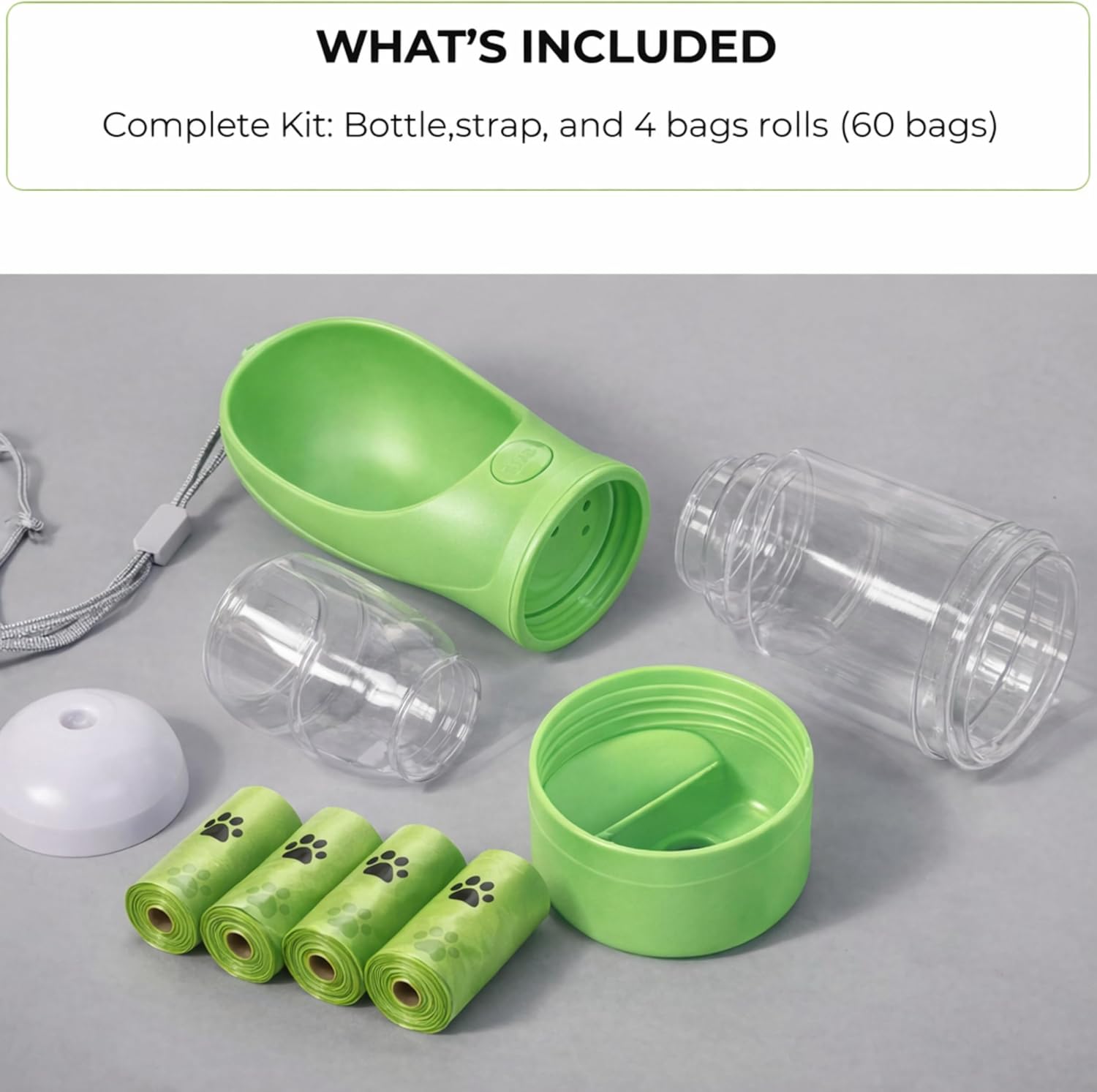 ✨ ALL-IN-ONE SOLUTION FOR BUSY PET PARENTS – Stop juggling multiple items! Our 3-in-1 design combines a 13,5oz (400ml) water dispenser, 100g food container, AND built-in waste bag holder with 60 premium bags included. Perfect for dogs and cats of all breeds and sizes. Travel light, stay organized, adventure more!