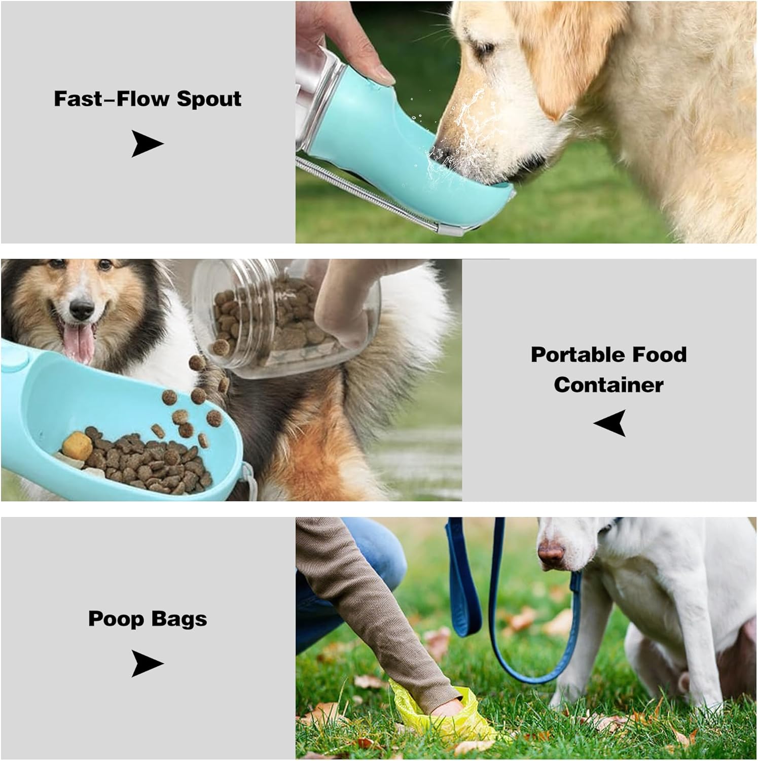 3-in-1 Functiona:ity Combines a water bottle, food container, and poop bag dispenser into one compact design, perfect for all your outdoor adventures.