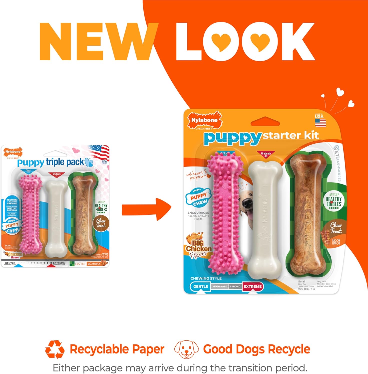 This Puppy Triple Pack features 2 chew toys and 1 tasty chew treat to satisfy your growing puppy through every chewing stage! Start with the soft and textured chicken-flavored bone to help ease teething discomfort and provide your dog a healthy chewing outlet. Next, graduate to the chicken-flavored Power Chew bone for puppies with powerful chewing styles or pups starting to get their permanent teeth. Finish off the chewing fun with a delicious Healthy Edibles all natural dog treat for puppies 6 months and older.