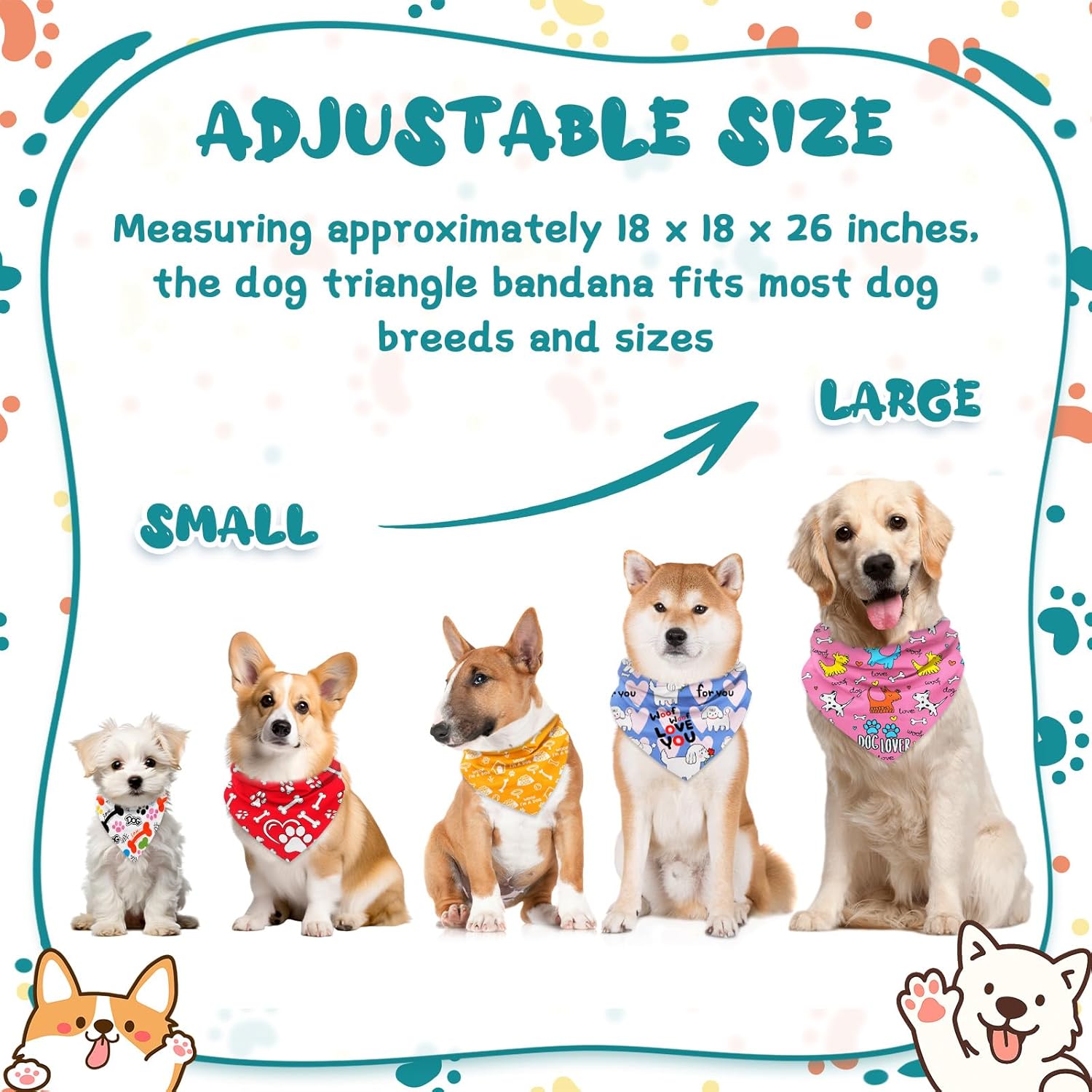 【Adjustable Fit for Most Dog Sizes】Each bandana measures approximately 18 x 18 x 26 inches, designed to comfortably fit small, medium, and large dogs. Simply fold and tie to customize the fit.