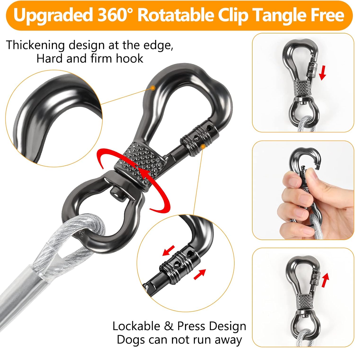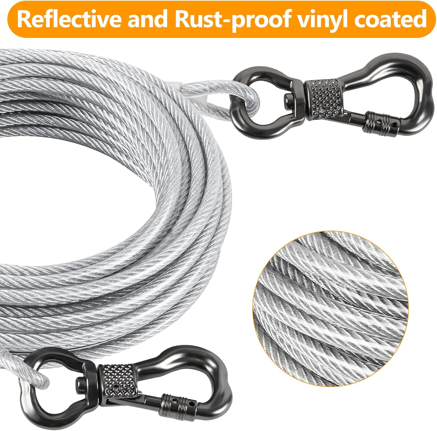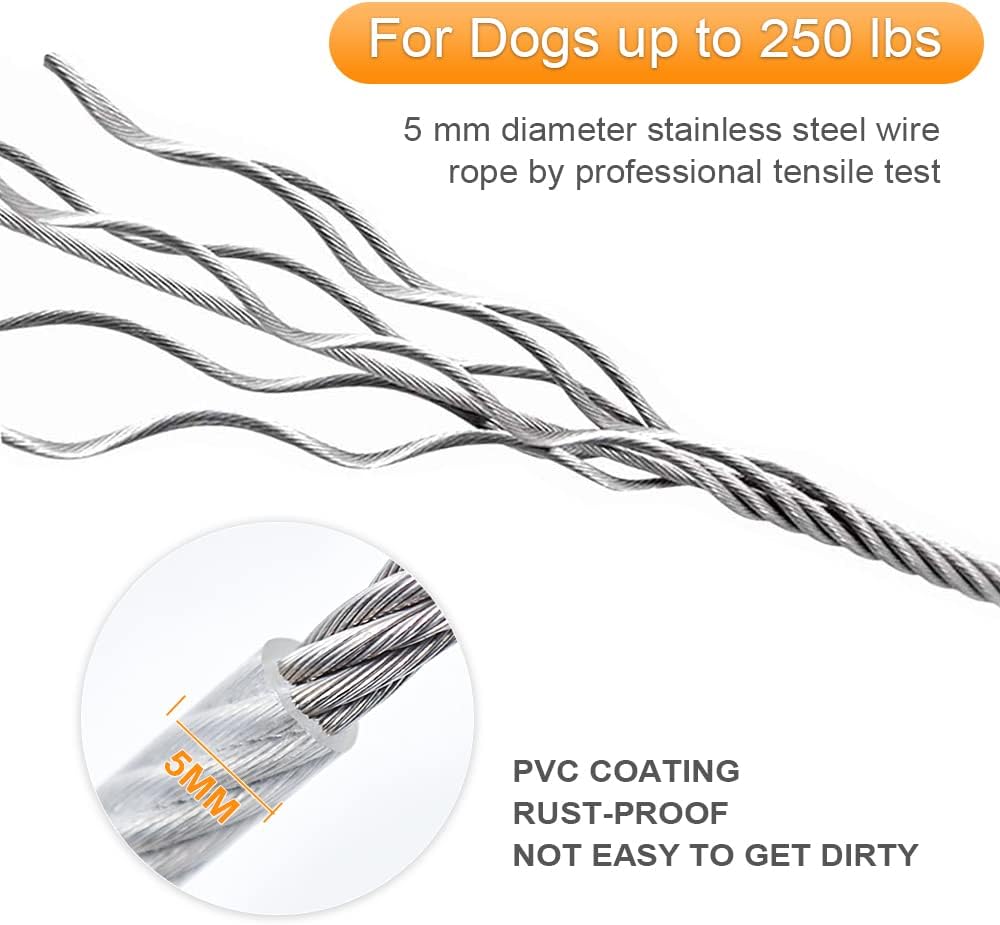 【Strong Anti-bite and Anti-rust Material】Made of steel and anti-rusty vinyl cover, it is strong and rustproof, so enduring that even a dog’s sharp teeth can’t easily broken it. Use swivel eye hook to fix on the post or stake, the other end is connected to the collar.