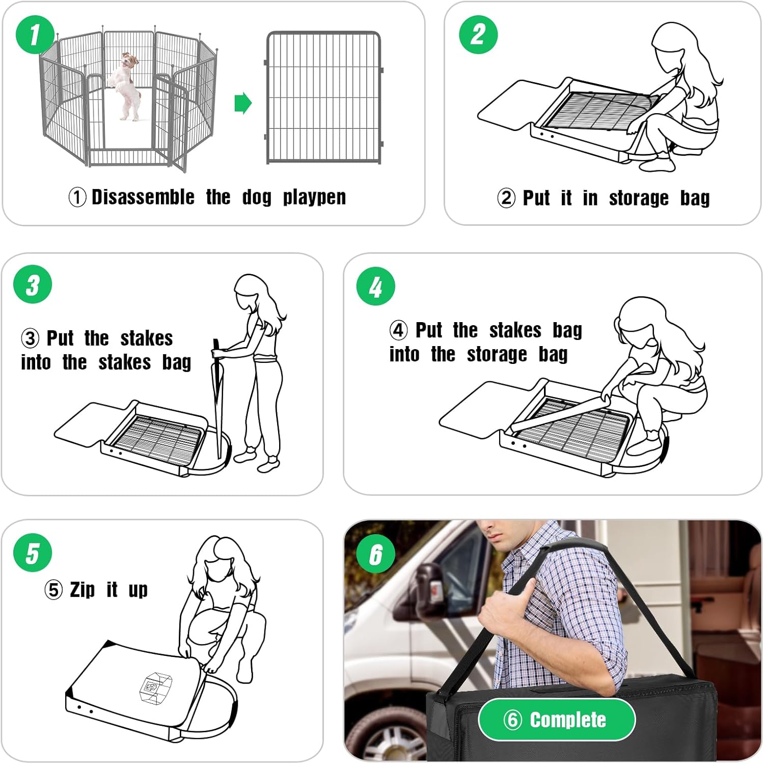 Dog Playpen Storage Bag: The dog playpen storage bag measures 28.3“ L x 7.9” W x 32.6” H. It is suitable for foldable metal exercise pet play pen for dogs, dog fence, great for RV traveling with dog. It can help you complete the storage of your dog fence and accessories. Extra stake bag can store up to 9 stakes, 36.2 “ H. Please check your fence size before purchase