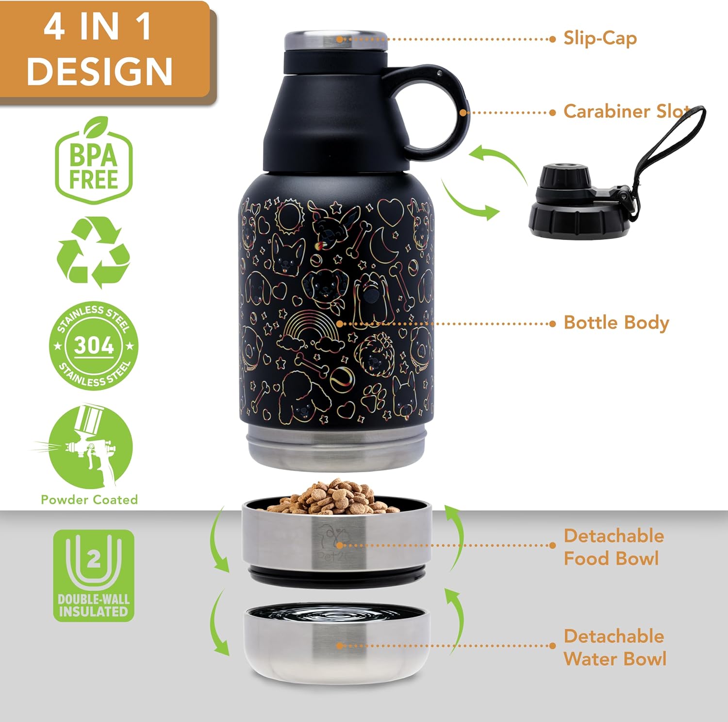 ✅ 3 COLORS WITH 3D ILLUSTRATIONS : With a body adorned in attractive 3D illustrations, our bottle is as stylish as it is sturdy. Our pet water bottle is designed to match your style and is available in three stunning colors—Blue, Gold, and Grey. This dog travel set includes 1 32 oz. water bottle, 2 lids, 2 detachable bowls, 1 treat pouch, and 1 box.