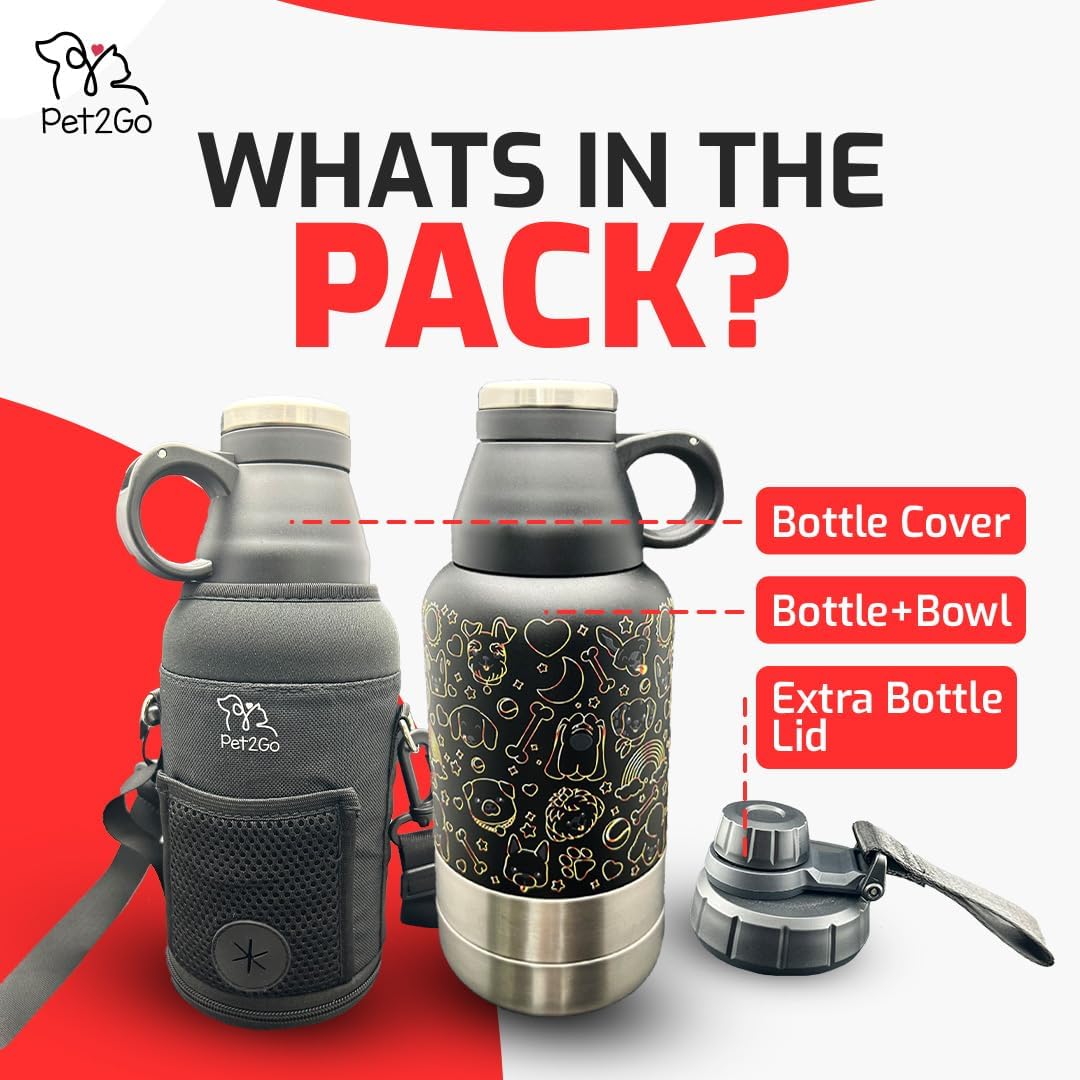 ✅ 3 COLORS WITH 3D ILLUSTRATIONS : With a body adorned in attractive 3D illustrations, our bottle is as stylish as it is sturdy. Our pet water bottle is designed to match your style and is available in three stunning colors—Blue, Gold, and Grey. This dog travel set includes 1 32 oz. water bottle, 2 lids, 2 detachable bowls, 1 treat pouch, and 1 box.