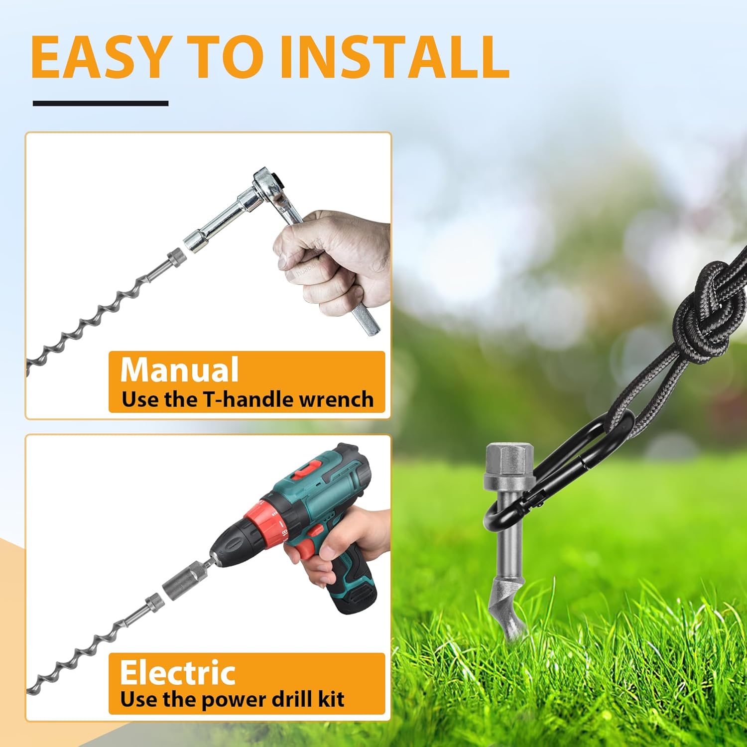 Fast & Easy Installation: No more struggling! Use the included socket adapter with a T-handle or electric drill to twist the anchors into the ground effortlessly. Carabiners allow for fast attachment and removal.