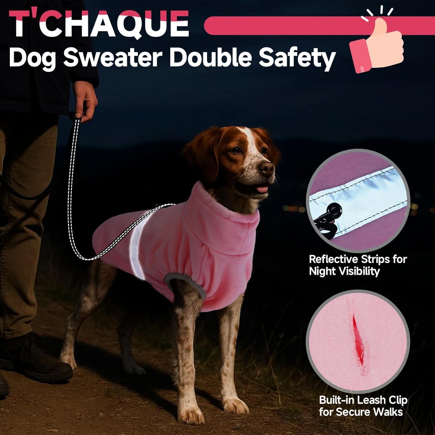 5 IN 1 Adventure-Ready Dog Fleece Vest: This 5in1 fleece sweater, equipped with a leash clip and 3 adjustable buckles at neck waist tail, it keeps your dog warm and protected from drafts—no need to worry if you size up! Reflective strips enhance low-light conditions safety, and the belly-friendly cut lets male dogs go freely. The dog sweaters silhouette maximizes freedom of movement while minimizing chafing