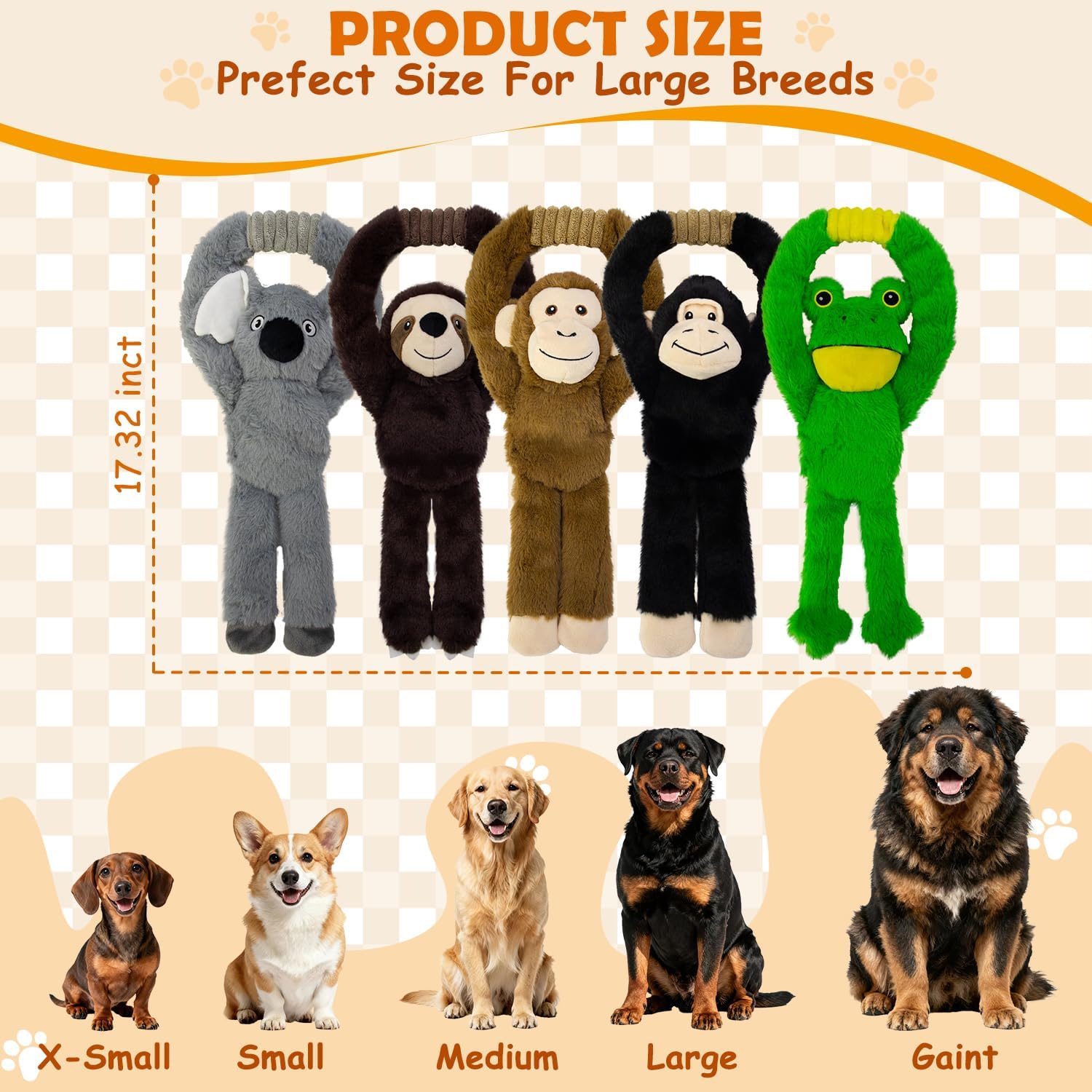 Great Value Set: This assortment value bundle plush pet toy contains 5 pack: koala, sloth, monkey, gorilla, frog. The funny and enrichment toys help dogs to exercise more and improve their health. A good dog products for boredom and stimulating. They can do chewing and teething, tug of war games. Quality interactive playing time together will also increase their bond with owner. It’s the best gift supplies for dogs Birthday Christmas Halloween or any holiday.