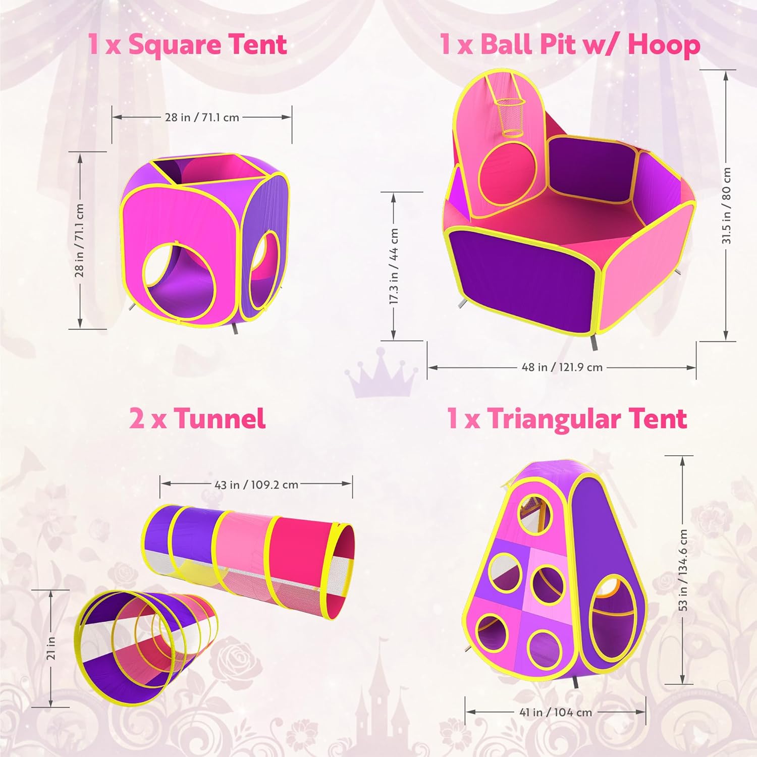 DREAMY WONDERLAND This 5-piece Premium Prima Princess indoor & outdoor pop up playhouse in Pink, Yellow & Purple shades includes spacious kids play tents, big kids ball pit with basketball hoop, interactive crawl tunnels obstacle course that will keep children entertained for hours. Kids can enjoy endless possibilities by customizing tent and tunnel configurations! A must-have toy for any active kid, toddler, baby, cats & dogs, and even adults.