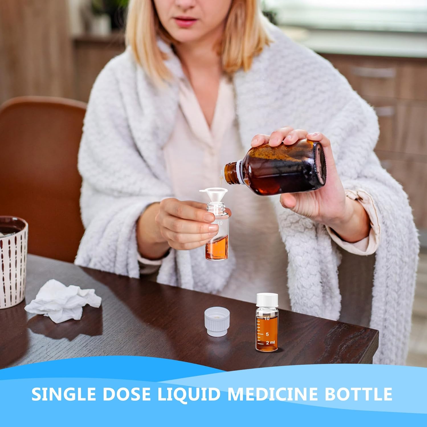 GLASS MATERIAL: Our single dose medicine container is made of high-transparency borosilicate glass, equipped with sealing plug, leak-proof and safe. The label paper help clearly indicate the type of medication and prevent confusion. The funnel help easily dispense and no spills