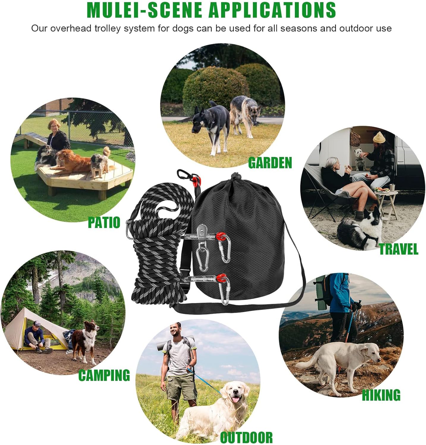 🐕 『Easy Setup & Teardown』: Dog trolley system is specially designed for dog outdoor events and very easy to set up,you can finish it within 5 minutes which is firmer and not easy to fall off. The dog tie out cable for camping can set up anywhere you want, between two trees or other anchor points. Our overhead trolley system for dogs can be used for all seasons and outdoor use, whether the park, garden, forest, mountain, or your own yard.