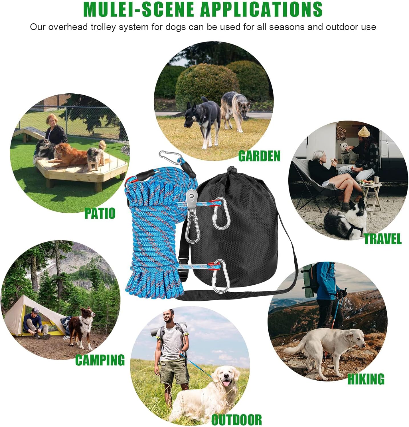 🐕 『Easy Setup & Teardown』: Dog trolley system is specially designed for dog outdoor events and very easy to set up,you can finish it within 5 minutes which is firmer and not easy to fall off. The dog tie out cable for camping can set up anywhere you want, between two trees or other anchor points. Our overhead trolley system for dogs can be used for all seasons and outdoor use, whether the park, garden, forest, mountain, or your own yard.