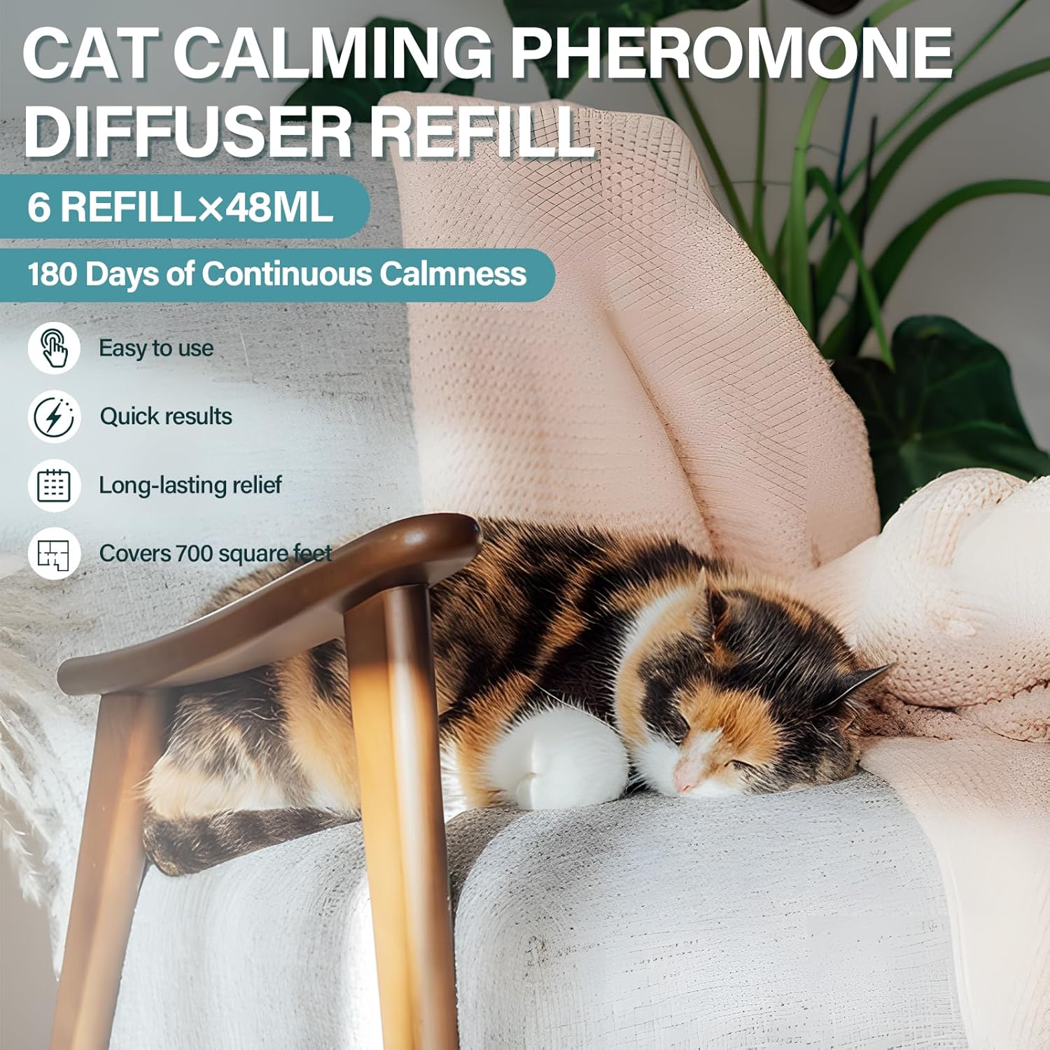 180 day lasting calm: Cat pheromones calming diffuser refill features advanced calming cat pheromones technology to ensure cats stay in a stable state of calm longer. Cat pheromone diffuser refill set includes 6 48ml cat calming diffuser refill, cat diffuser calming provide cat with ongoing peace of mind for up to 180 days. For best results, place the calming diffusers for cats in an area where cats frequent and avoid obstructions above the cat calming diffuser that may affect diffusion