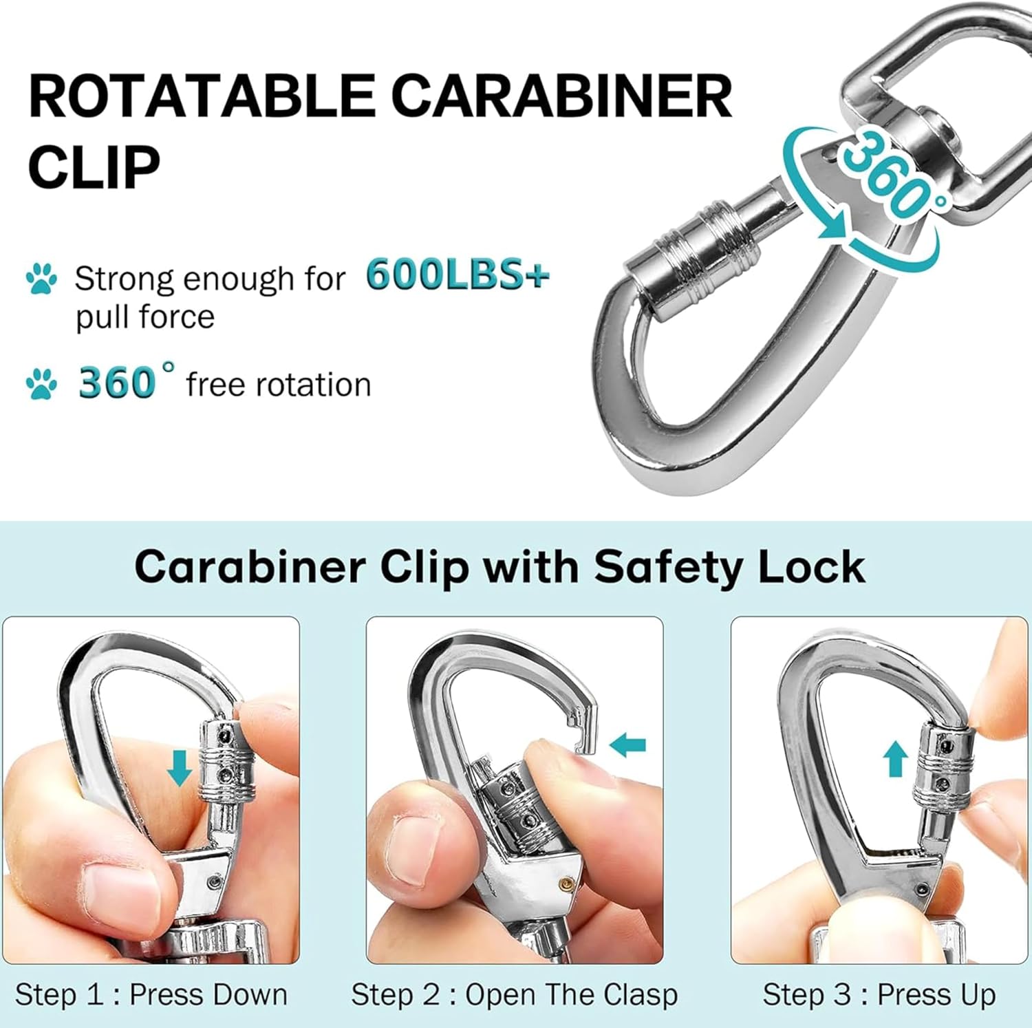 3. Easy to use: Just tie the two ends of this dog run cable to two trees, and attach the dog leash to the Connection Ring, then the screw lock is designed to ensure that the locked cable will never be opened by the dogs. The trolley system can be installed by one person in just 5 minutes.
