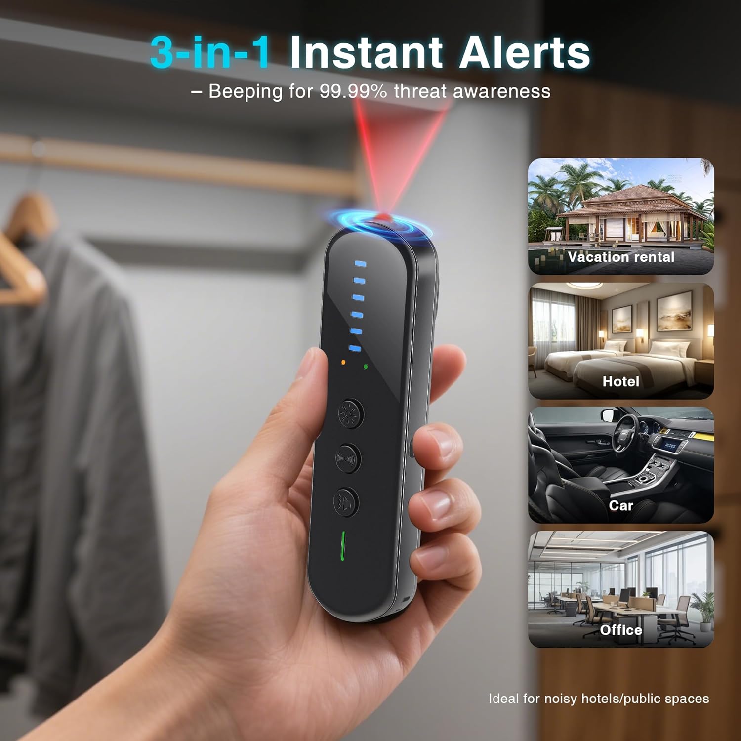 3-in-1 Instant Alerts – Never Miss a Hidden Threat, The AOBOCAM S501 goes beyond other basic detectors with its 3-in-1 instant alert system—combining flashing LEDs, strong vibrations, and adjustable audio beeps to ensure no hidden threat goes unnoticed. Unlike conventional devices that rely solely on sound, this AI-powered anti-spy tool provides multiple, unmistakable warnings, making it ideal for noisy environments like hotels or discreet sweeps in public spaces. Perfect for scanning hotels, offices, vehicles, and changing rooms, it eliminates risks from spy cams, trackers, and bugs.