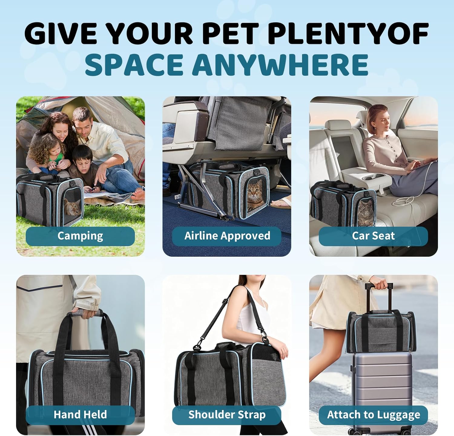 Airline Approved Cat Carriers – MEASURES 17”L*11”W* 11”H, AIRLINE APPROVED UNDERSEATED PET CARRIER.This soft side carrier for large cats is designed with a expandable interior space, comfortably accommodating pets up to 20LB, allowing them to stand, turn around, and lie down during travel.