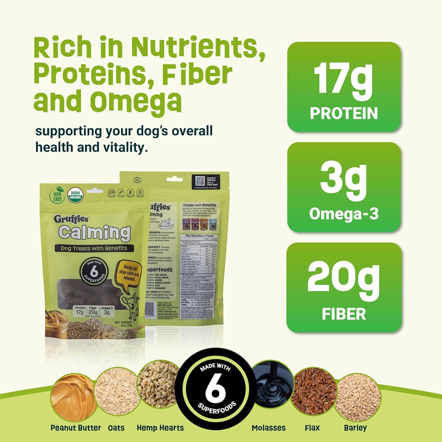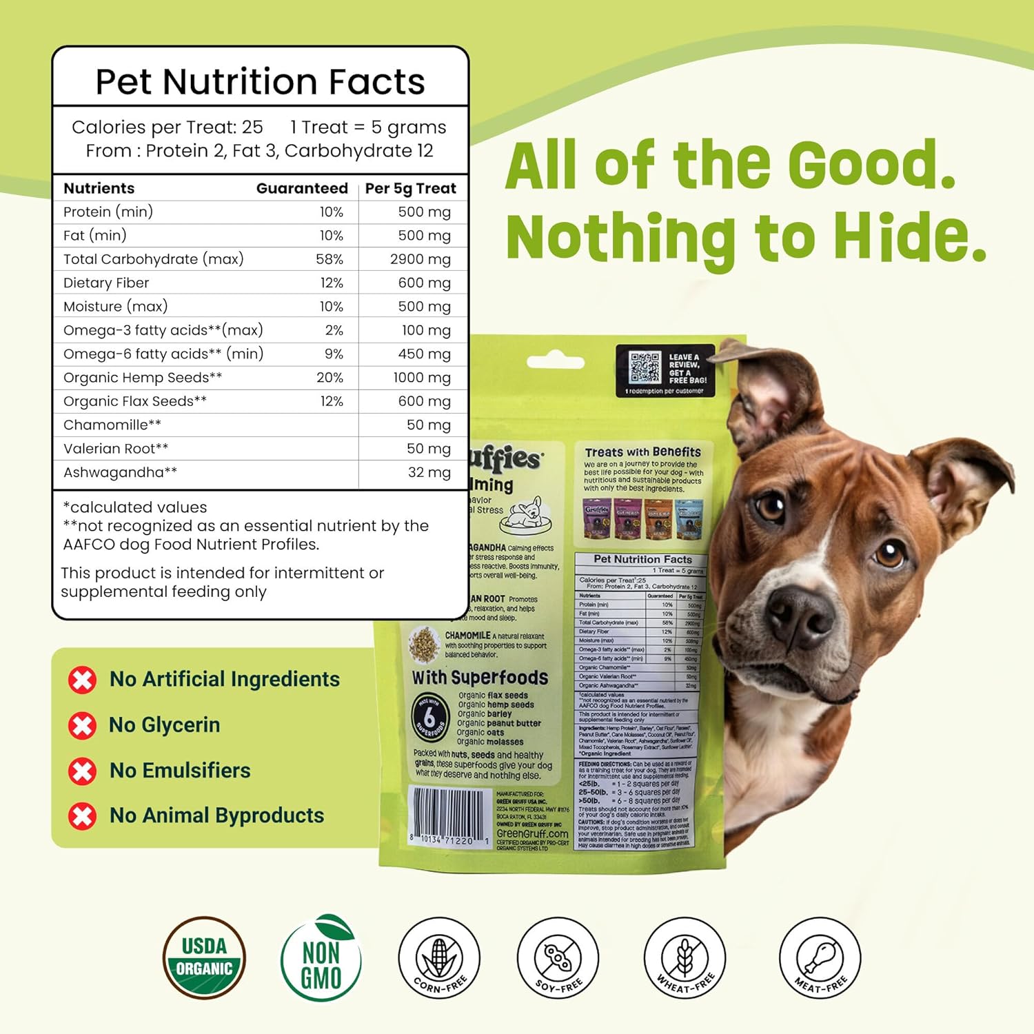 🩺 USDA Organic, Non-GMO & Clean Ingredients – Made with premium ingredients sourced from North America. Gruffies Calming Organic Dog Treats are USDA Organic, Non-GMO, and completely free from soy, wheat, corn, glycerin, or artificial additives.