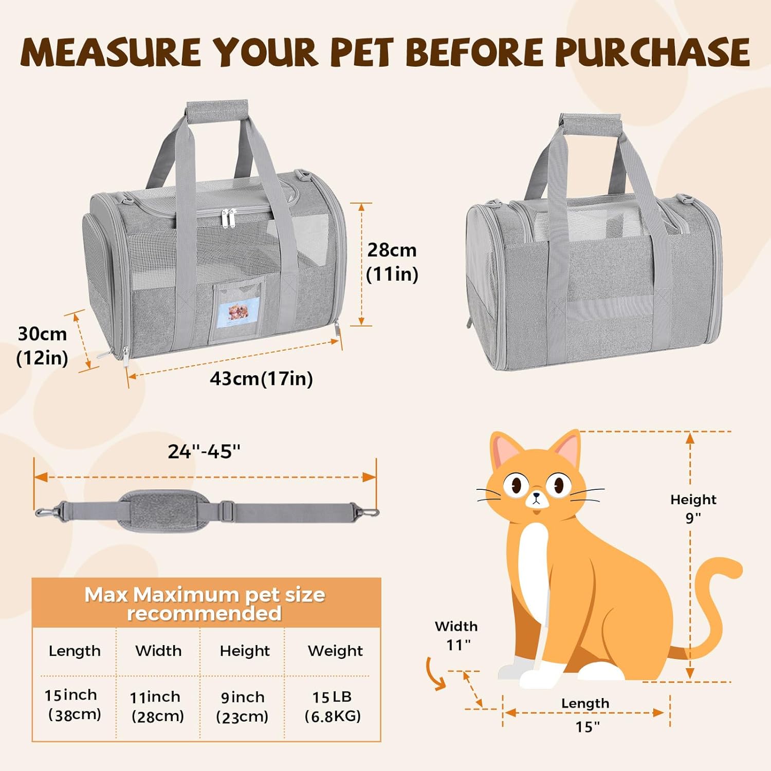 Spacious Design: This cat carrier Measures 17″x12″x11″ — roomy enough for small/medium cats and dogs up to 15 lbs. For the perfect fit, we recommend measuring your pet’s length and height before ordering.