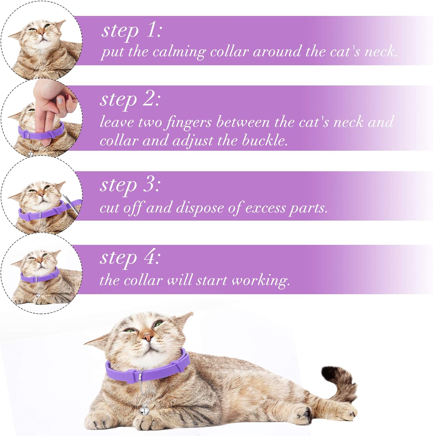 Package content: you will get 4 pieces of purple soothing cat collars to reduce cat’s anxiety; The sufficient quantity is enough for your replacement; There are 4 pieces of silver bell pendants and 4 pieces of chains for easy attachment to the cat adjustable calming collars