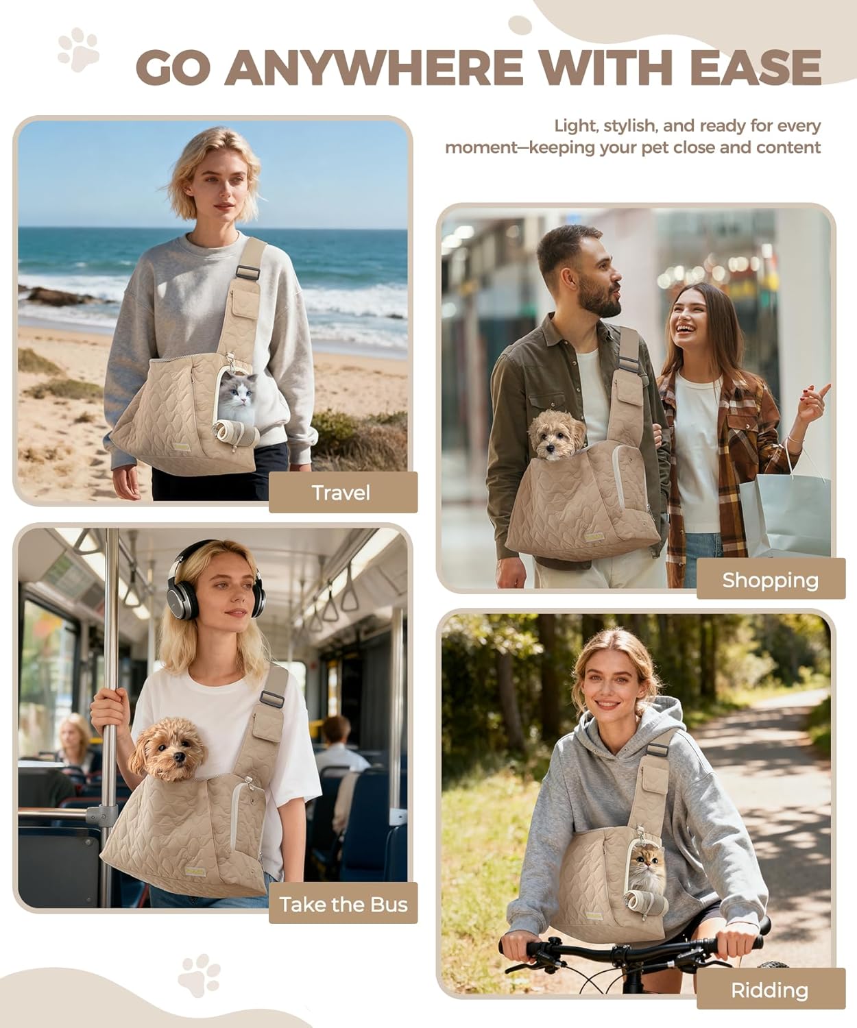 Hands-free small dog sling carrier with hard bottom for hiking Secure front facing dog carrier perfect for biking and cycling Stylish quilted Dog Sling tote bag for shopping and daily errands Portable dog carriers for small dogs on subway bus public transport