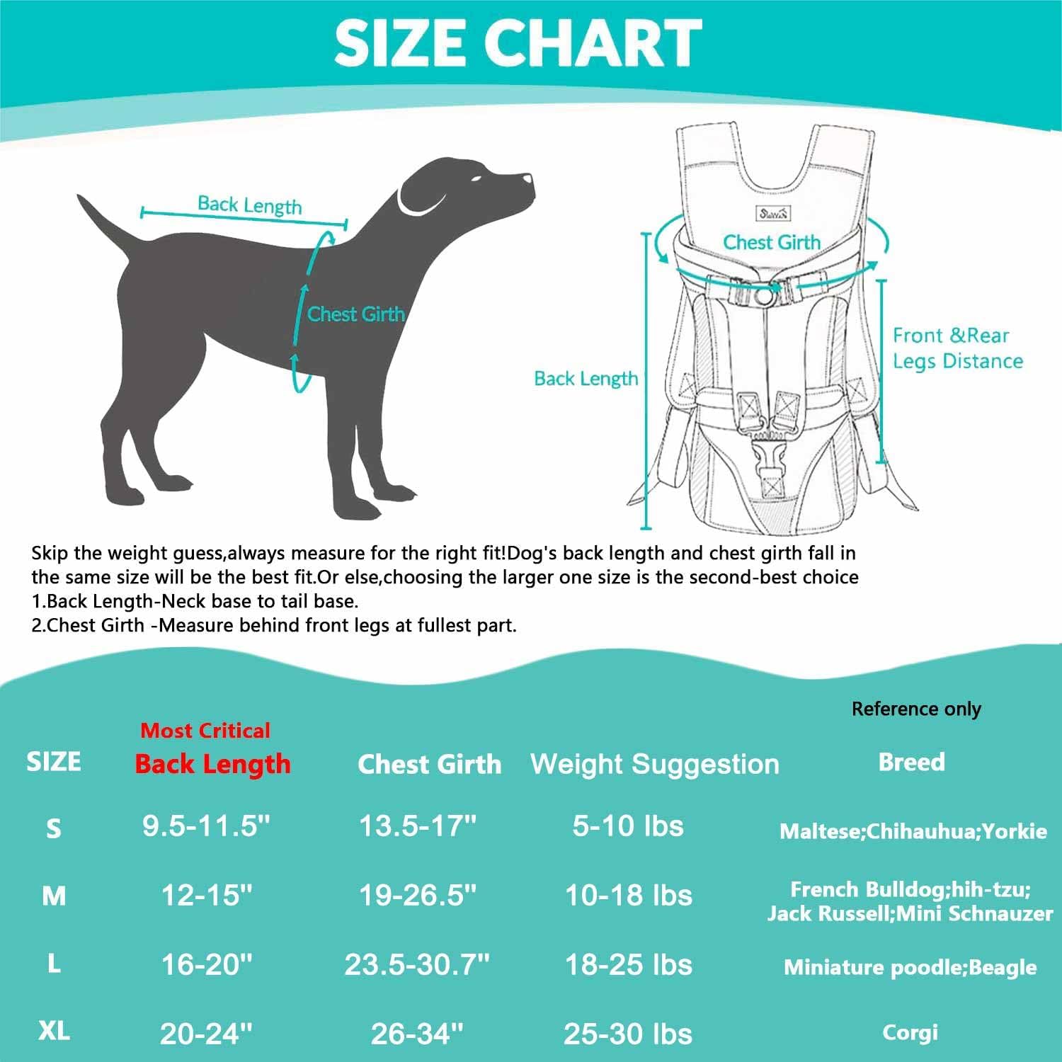 Small: Back (9.5-11.5 in), Chest (13.5-17 in),Weight for reference (5-10 lbs)Medium: Back (12-15 in), Chest (19-26.5 in),Weight for reference (10-18 lbs)Large: Back (16-20 in), Chest (23.5-30.7 in),Weight for reference (18-25 lbs)X-Large: Back (20-24 in), Chest (26-34 in),Weight for reference (25-30 lbs)