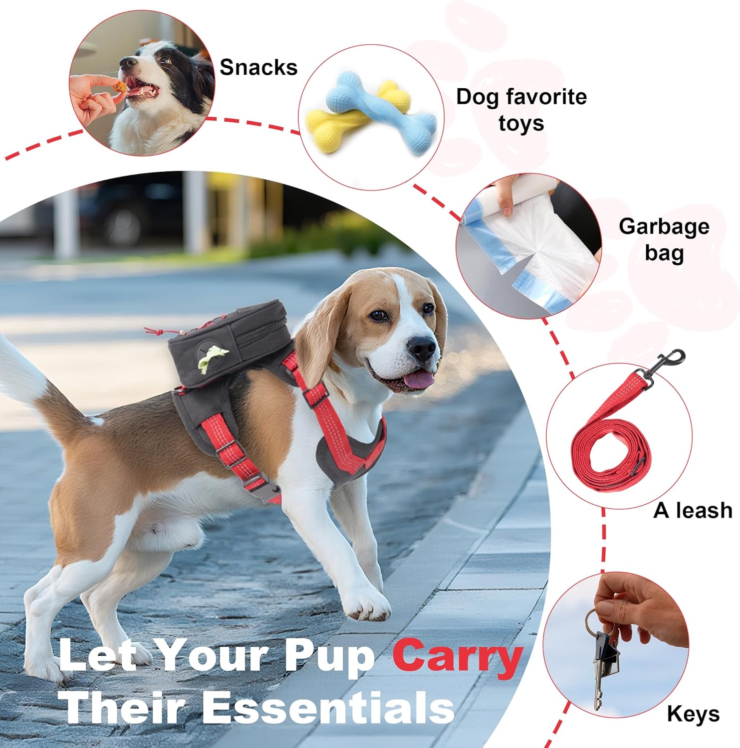 【Bonus safety leash and built-in storage】Pet backpack has a built-in poop bag dispenser for snacks, small toys or waste bags, making it easy for your dog to carry when walking or going out. The front reflective drawstring keeps small items safe and improves visibility at night for added safety. A bonus durable safety leash gives you better control over your dog and peace of mind.