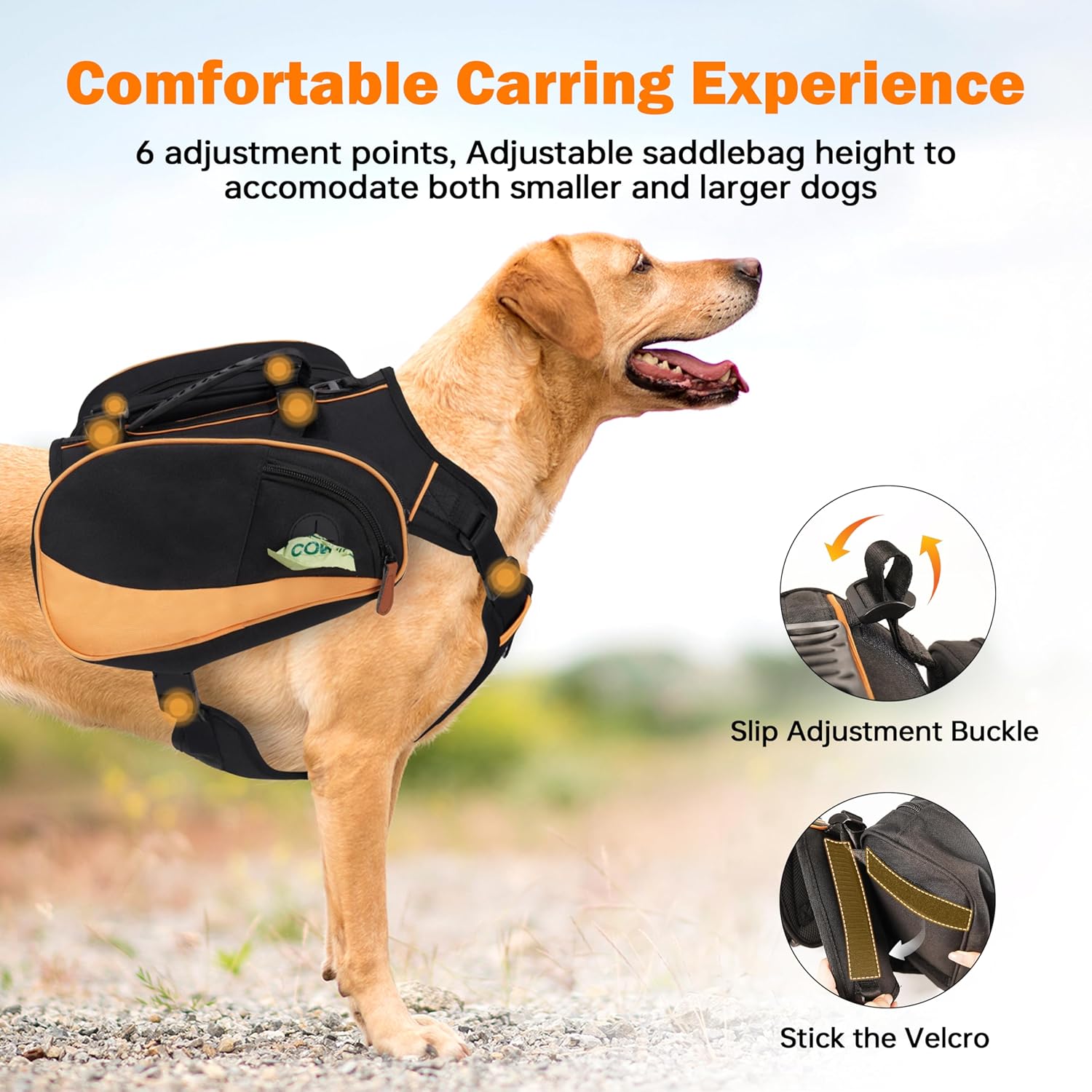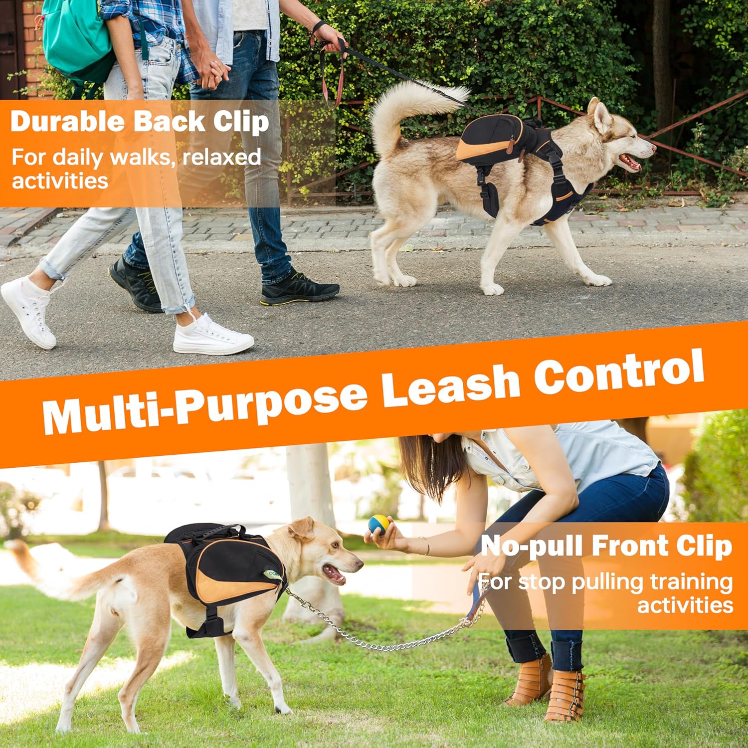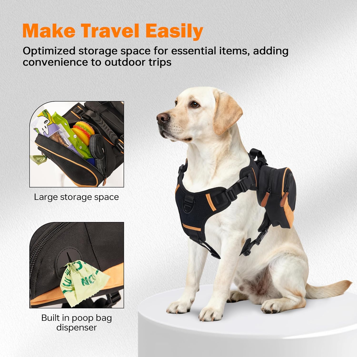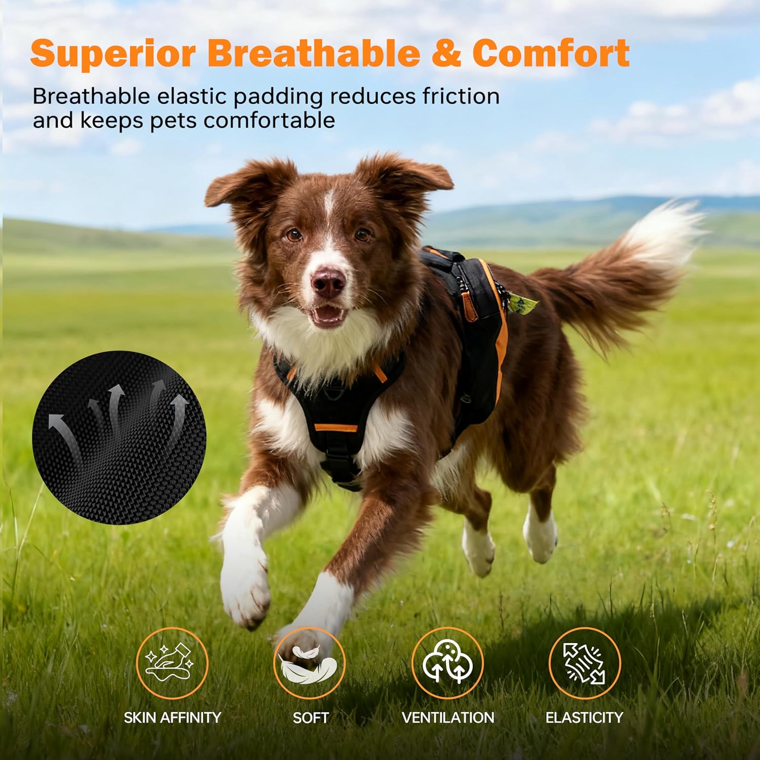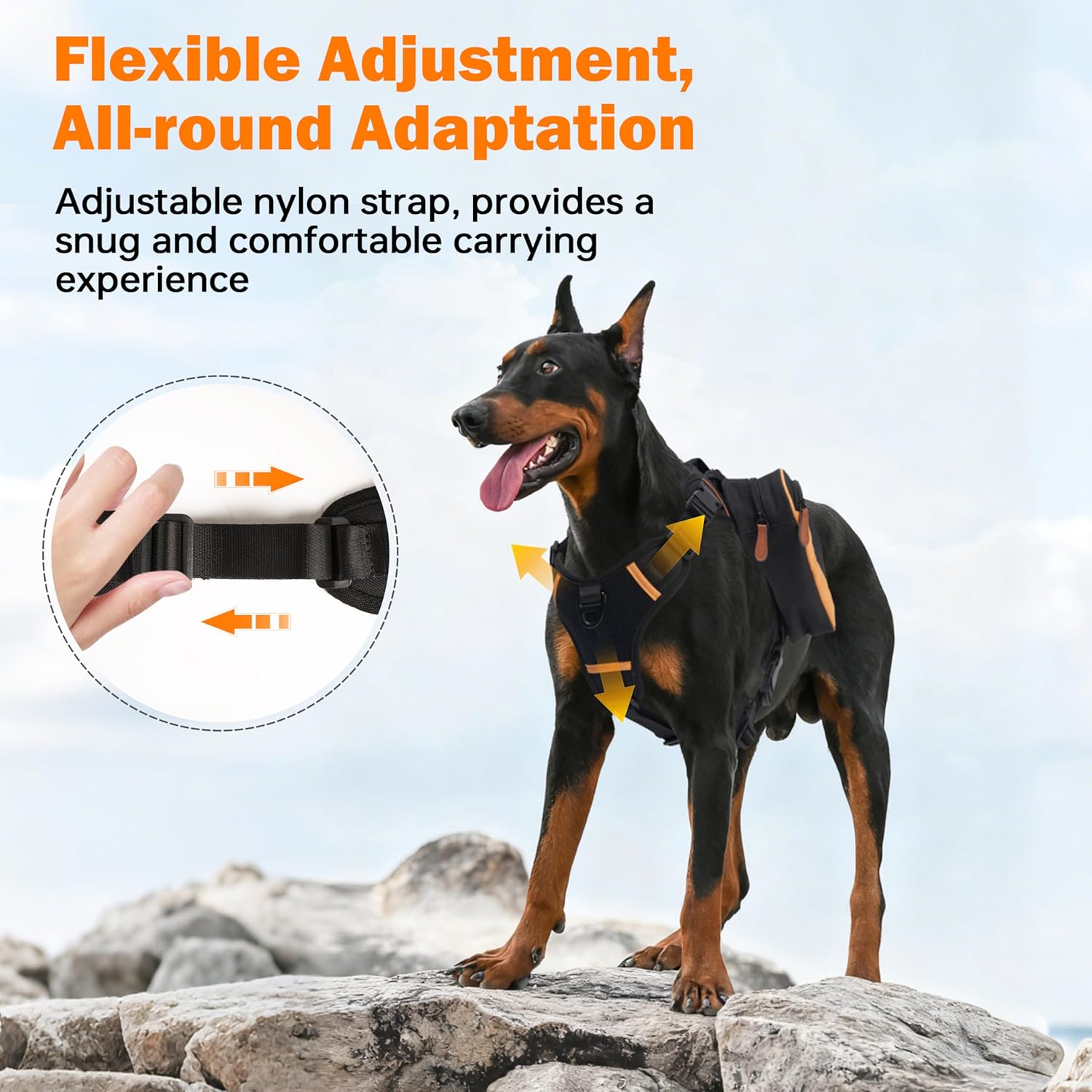 【Dual Storage Packs & Non-Slip Top Handle】Independent packs on each side feature adjustable buckles to fit dogs of various sizes, improving load balance and stability. The optimized storage space fits water bottles, snacks, and other essentials for pets or owners. The non-slip top handle helps dogs navigate obstacles and offers secure short-distance lifting support.