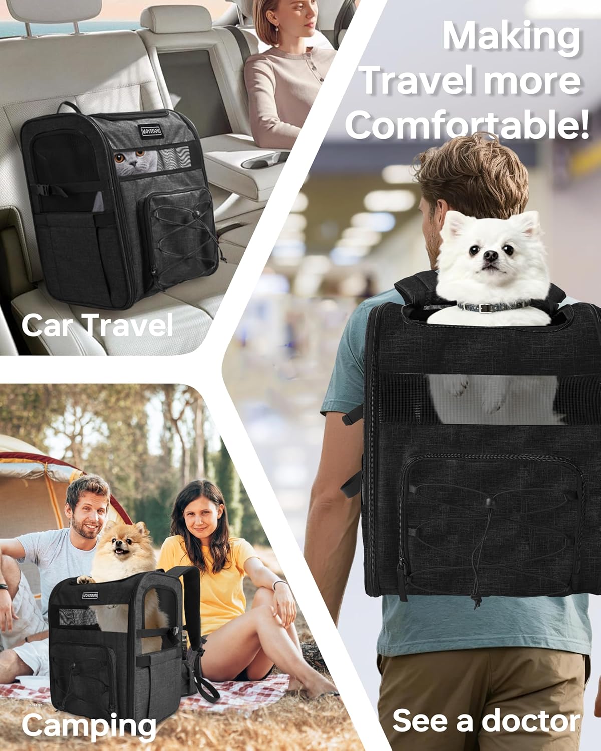 Pet Adventure Backpack: This dog carriers for small dogs is designed for dogs up to 13lbs and cats up to 17lbs. A top zippered mesh opening near the shoulder strap lets pets easily peek out and stay close to their owner. It includes a reinforced bottom board that provides firm, even support, prevents sagging or sinking, and helps pets stay comfortable and balanced.