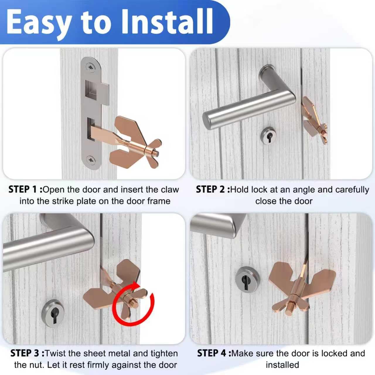 Tool-free Installation: No need to nail or screw into anything, just insert the claws into the strike plate, close and lock the door, and then tighten the wing butterfly screw. Even if someone else has the key, they can’t open your door