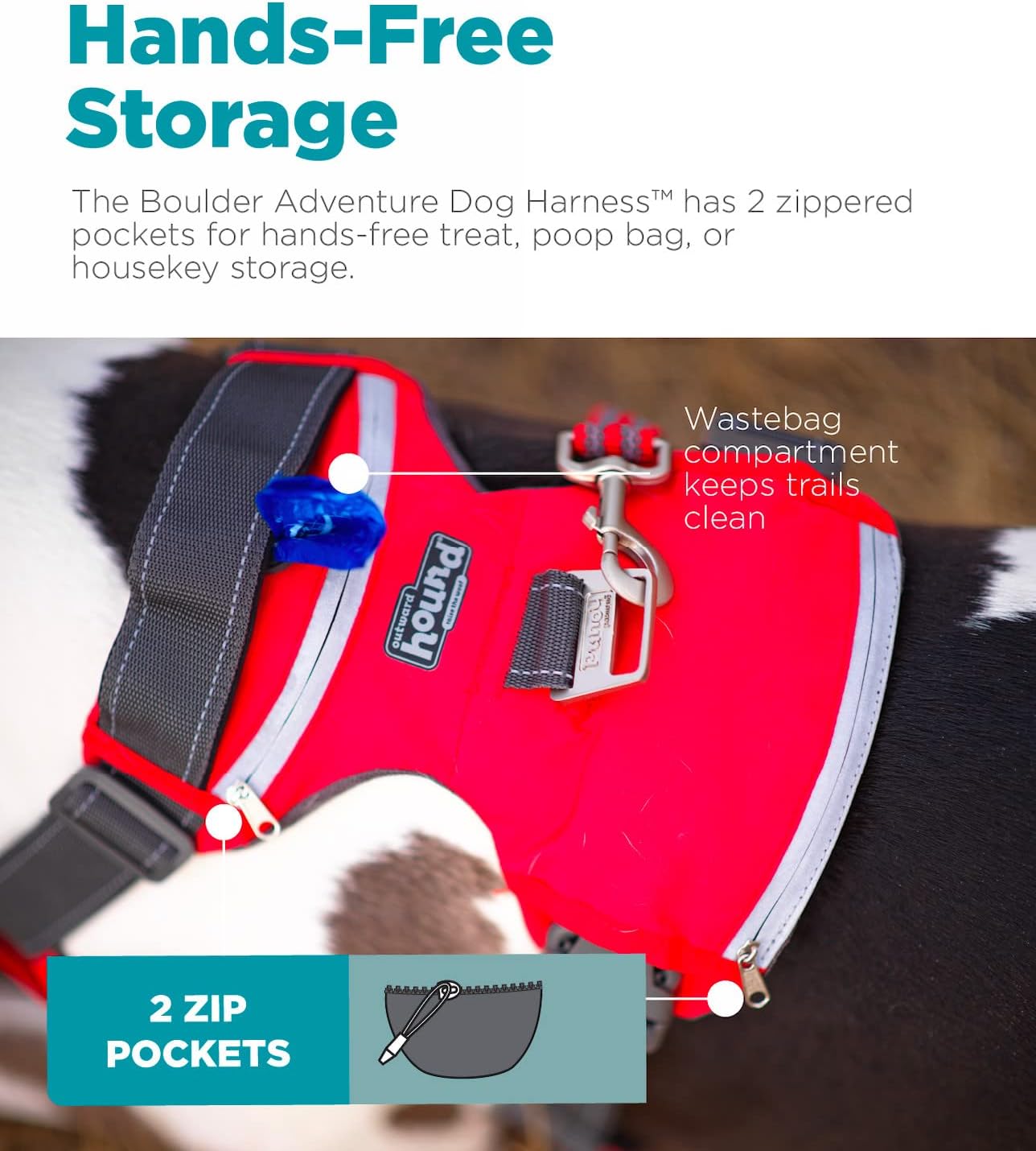 2 STORAGE POCKETS: The Boulder dog harness has two zippered pockets for hands-free treat, poop bag, or house key storage.