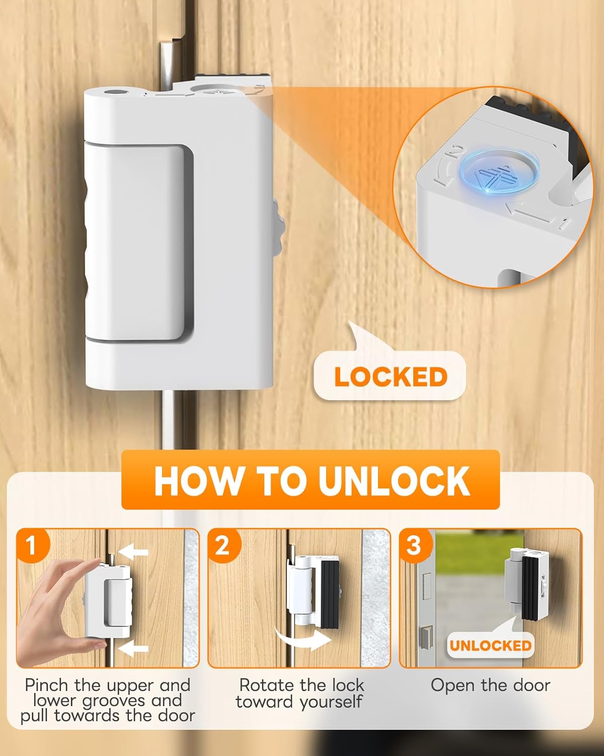 No-Drill Portable Door Lock: The door safety locks from inside measures just 2.4 inches in size and requires no drilling for installation, making it easy to carry during business trips or travel. It can be installed on the door of temporary accommodations, ensuring that every outing is accompanied by a “mobile security lock.”