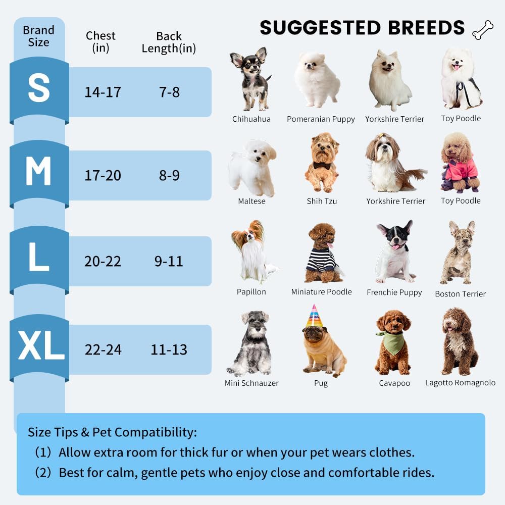 【Measure Before You Buy】 Always measure your pet’s back length and chest girth before purchase. If back length fits but chest girth is smaller, choose one size down. Weight is only a reference. Designed for calm rides and close snuggles; not ideal for restless or anxious pets. Padding may look flat from vacuum packing — just pat to restore shape