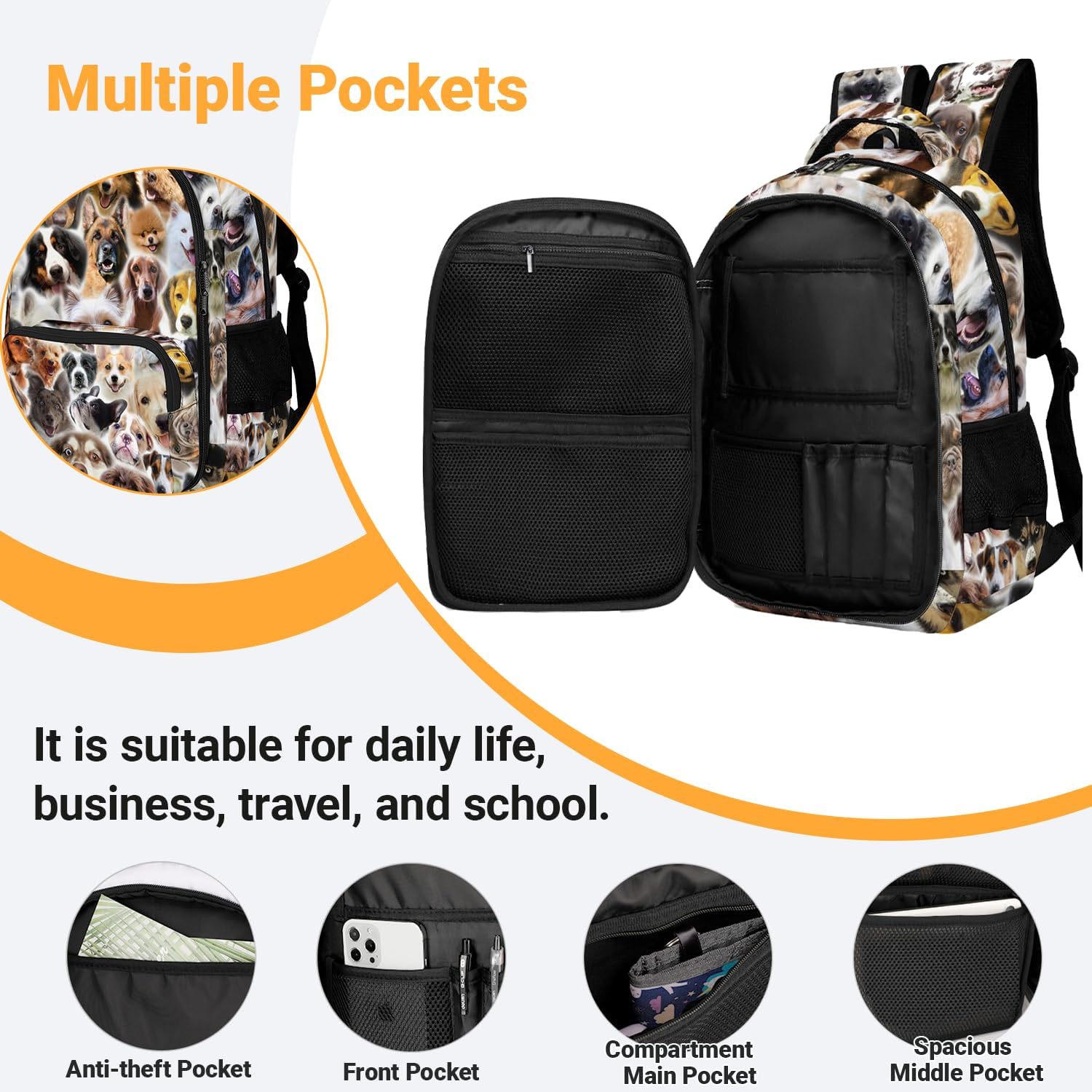DOG BACKPACK FOR BOYS & GIRLS: This adorable dog-themed backpack features vibrant colors and playful dogs prints, perfect for kids who love dogs and want to showcase their fun-loving personality. Its stylish design balances cuteness with practicality.