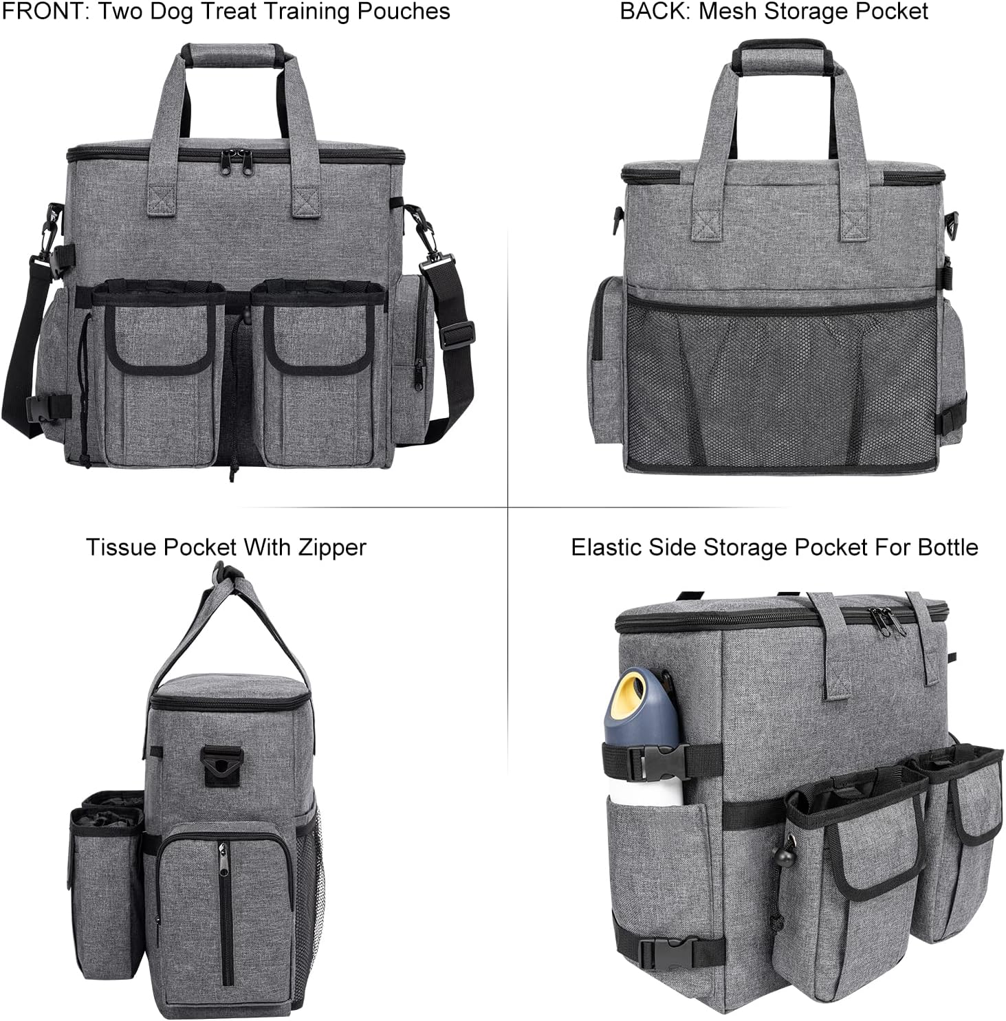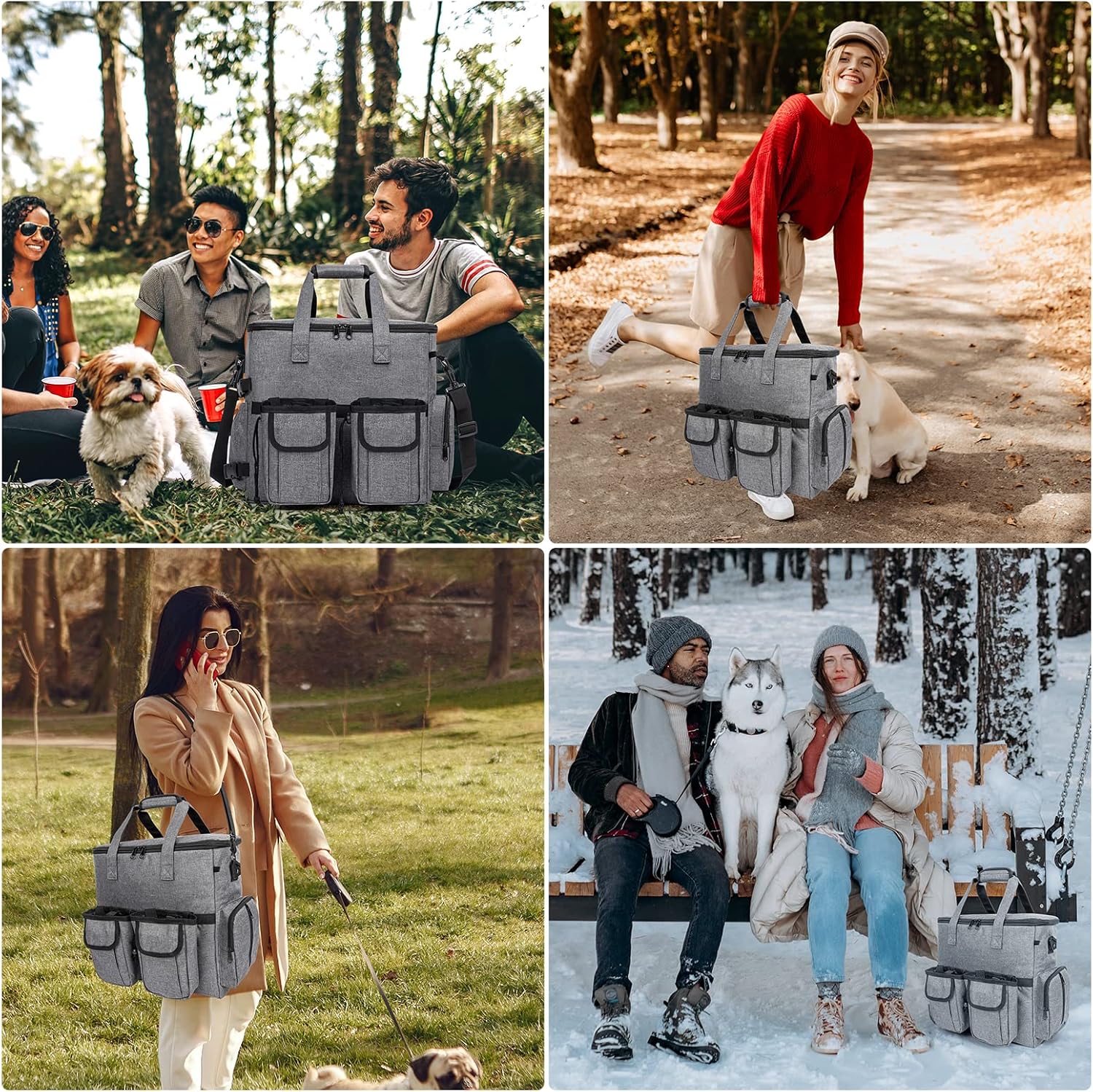 Travel bag for dog kit includes 1 Dog Tote Bag 1 Detachable Shoulder Strap 2 Dog Treat Training Pouches 2 Dog Food Carrier Bags 1 Water-Resistant Placemat 2 Pet Silicone Collapsible Bowls.